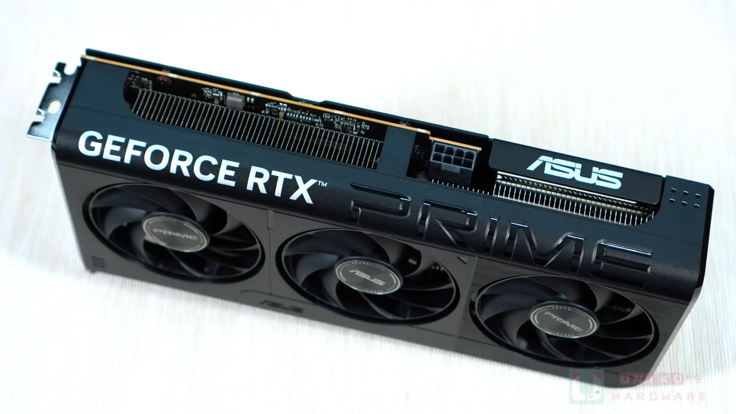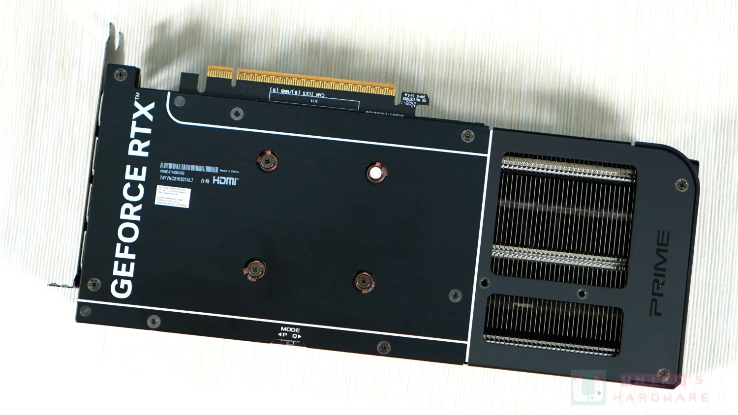華碩 PRIME 系列獨具特色,十分有標誌性的頂部彎曲過渡處理,除了白色的 GEFORCE RTX 字樣,黑色的 PRIME 字樣先凹後凸的做法很有巧思。背板也有一部份折角延伸,上面印有白色 ASUS 字樣。剛好這部份是垂直風道的範圍,應該是刻意控制側面開孔尺寸,盡量導風垂直排出。