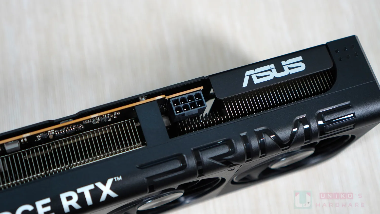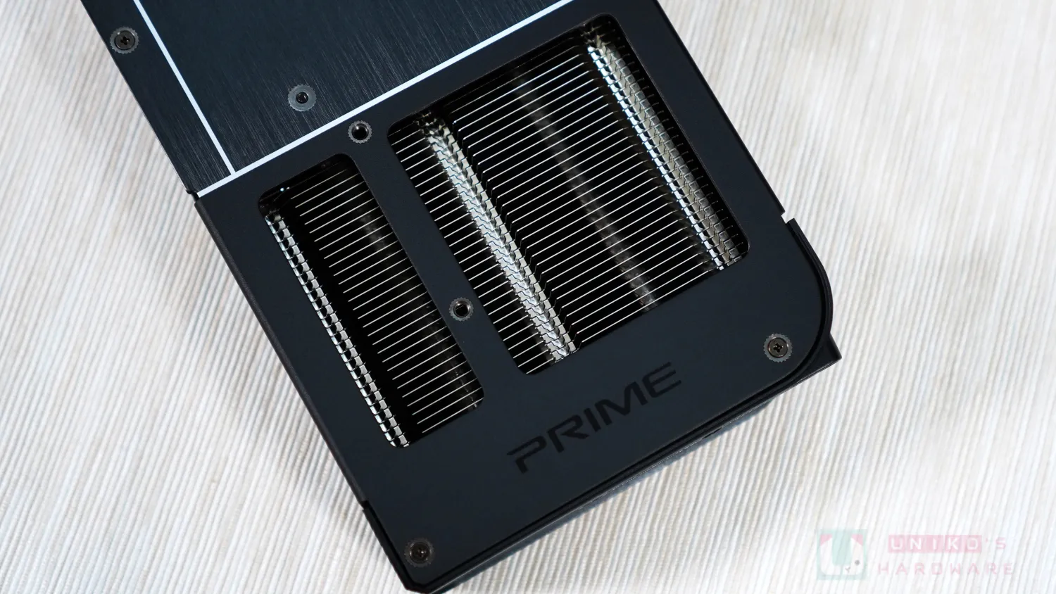 風扇外殼上的線條由白色變為黑色,整體感覺更低調更沉穩,正面刻有小小的 ASUS 字樣,配備金屬背板,盡顯誠意。背板上有白色的 GEFORCE RTX 字樣,也有黑色的 PRIME 字樣,後者比較小,似是反映體積才做此設計。
