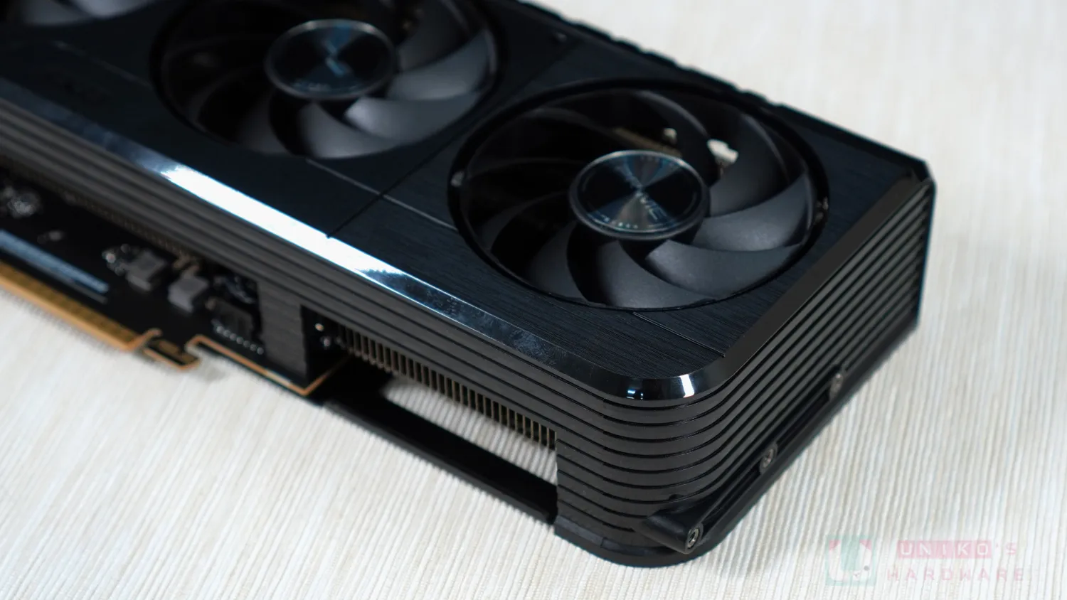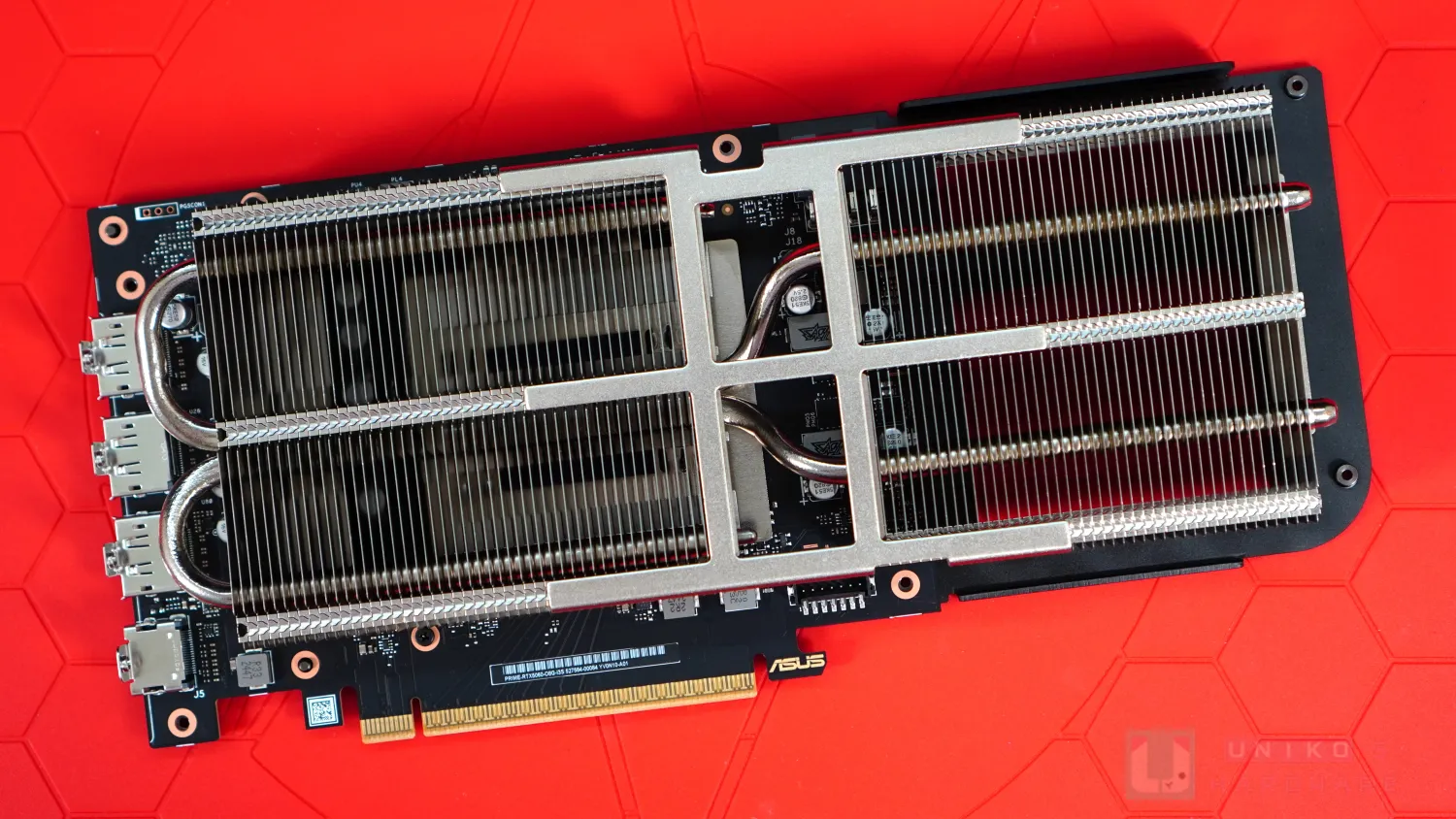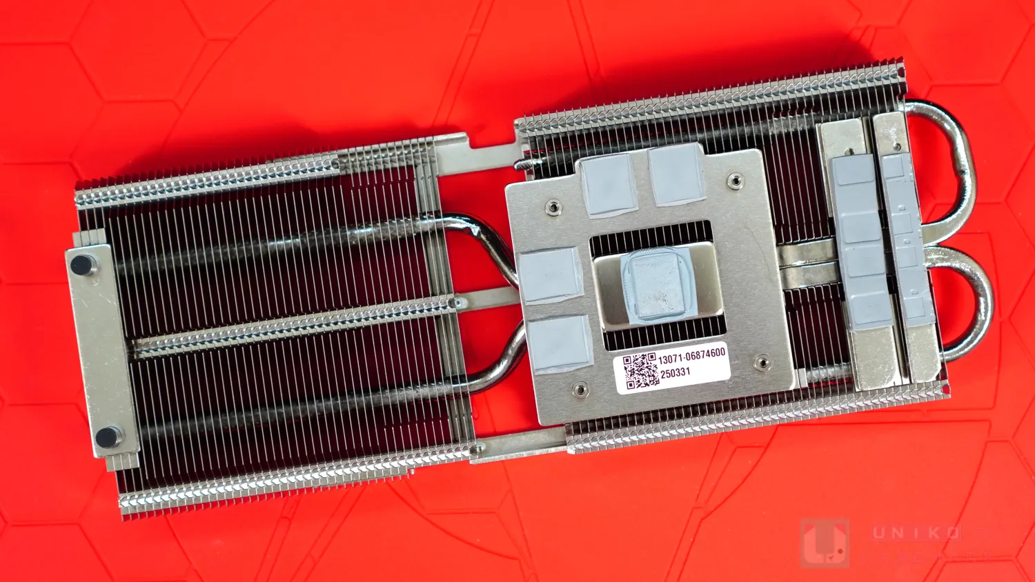 散熱鰭片可分為左右兩部份,其中一組正在核心晶體和記憶體晶片之上。兩根熱導管由銅底延伸,一邊迴轉焊接至上方鰭片組,另一邊直接延伸並焊接至另一組鰭片。