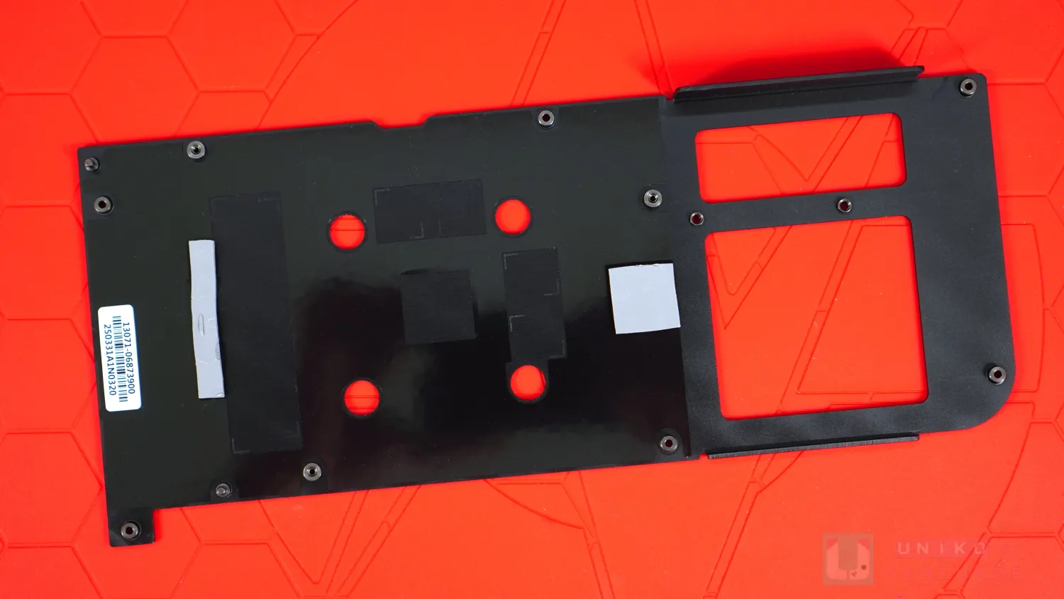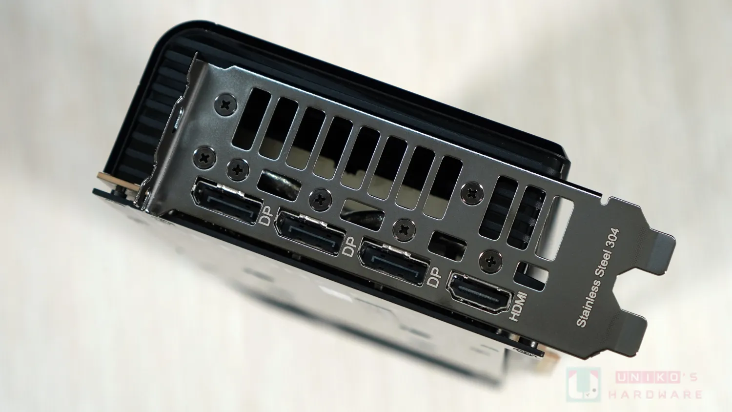 由於顯示卡長度更為保守,背板右邊的開孔尺寸也有相應調整,背板表面有一些白色線條,跟正面風扇外殼的黑線做出對比色,似是想區分與 RTX 5060 Ti 不同的意味。左邊 (靠近 I/O) 採用金屬髮絲紋,顏色更深,右邊 (散熱開孔) 的部份改成黑灰色,且是磨砂處理。