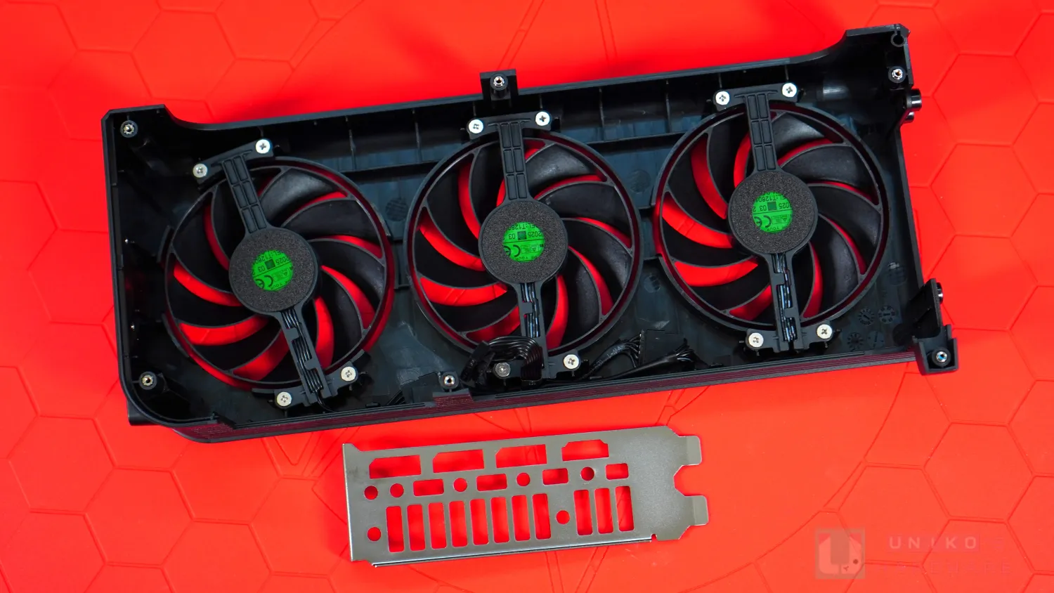 風扇外殼固定在背板和 I/O 擋板上,三風扇固定在外殼上,這種設計對於使用者來說非常友善,不只清理灰塵變得更輕鬆,甚至要換掉風扇或自行改裝固定三顆標準 25 mm 厚的風扇增強散熱也可以,DIY 玩味十足。三風扇本體尺寸一致,以逆順逆方式排列,同樣採用 9 扇葉 + 末端連成風扇環的設計。