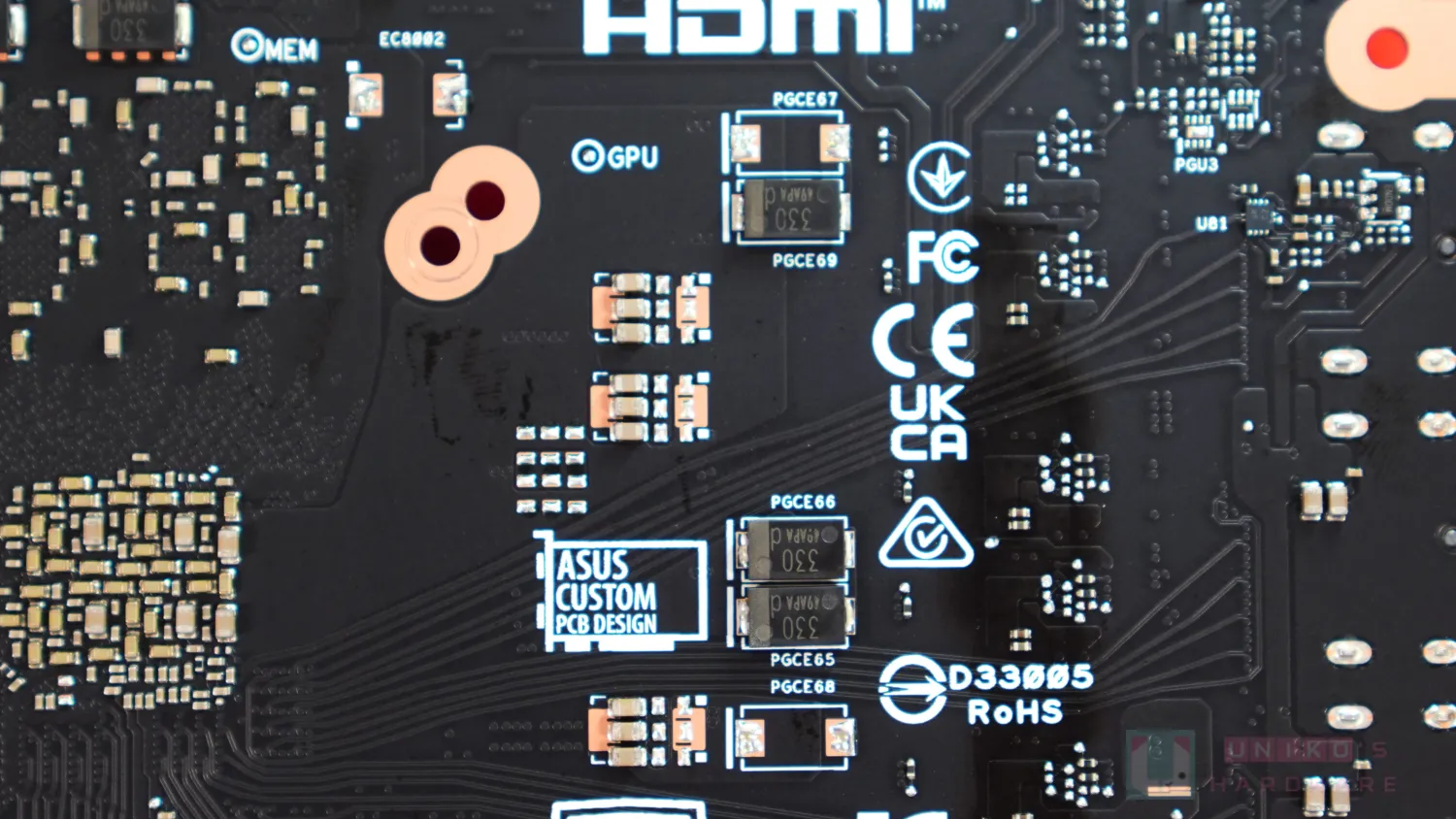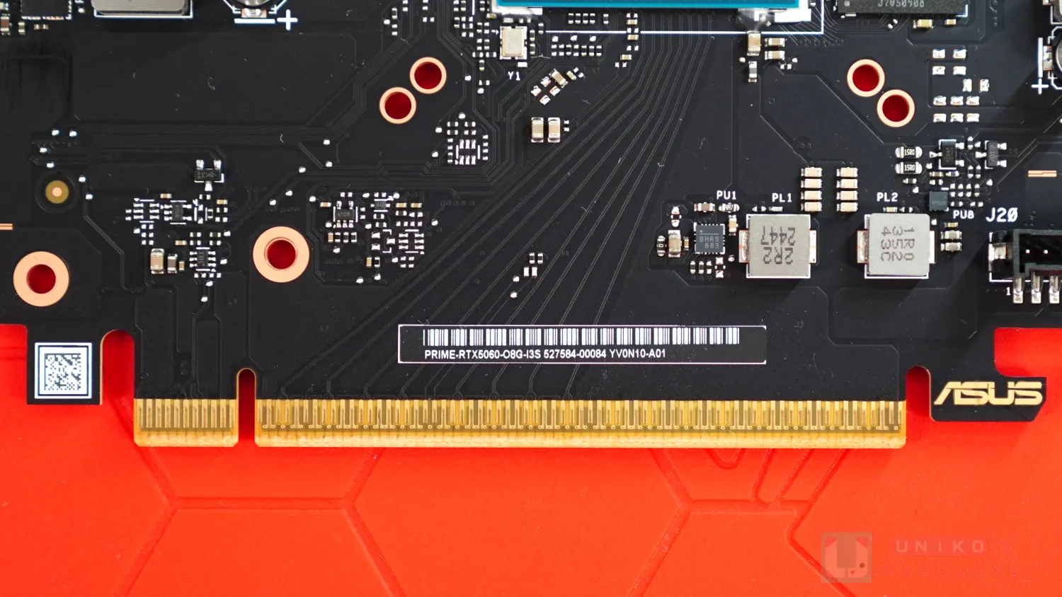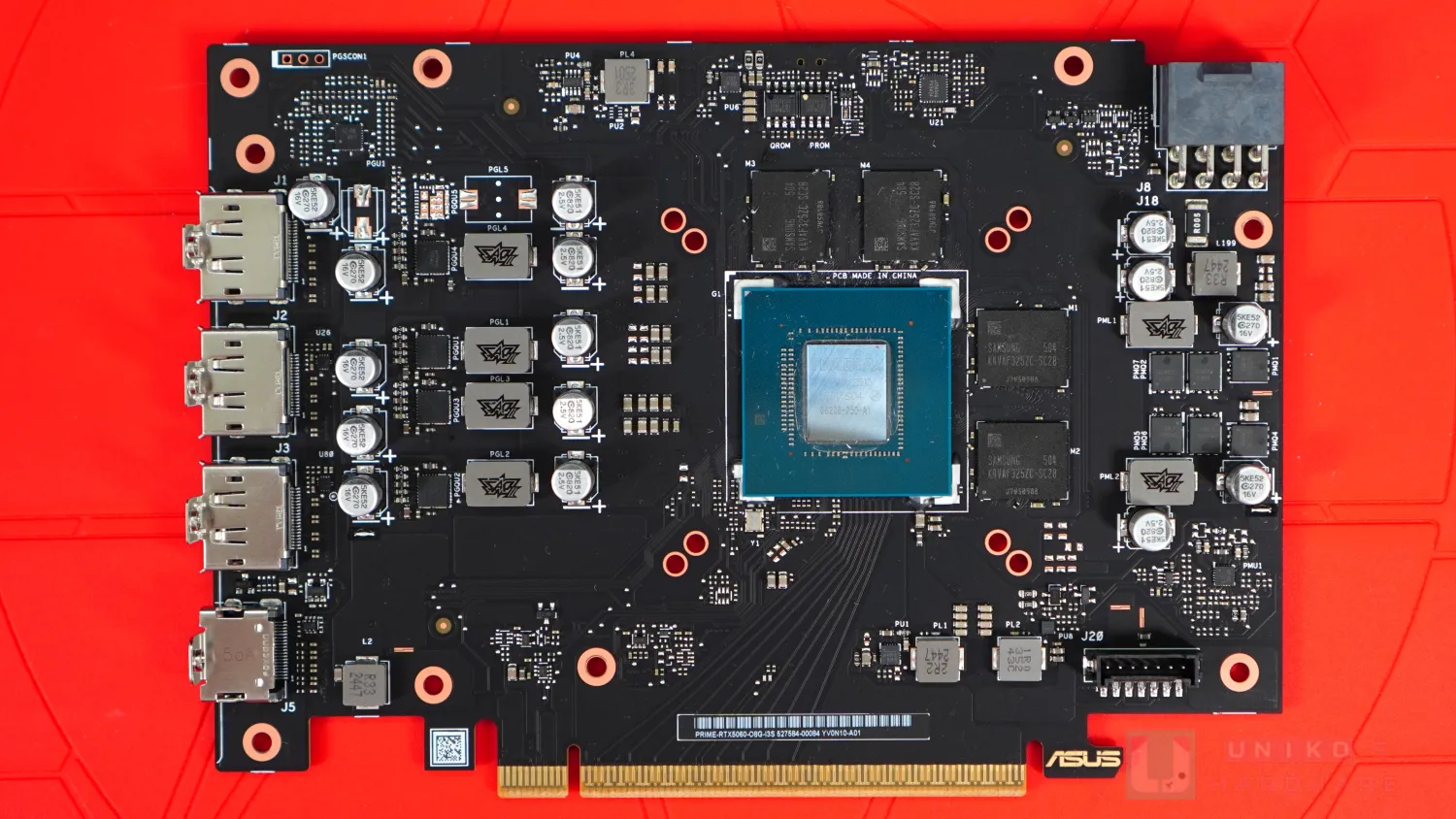 PCB 佈局頗有華碩近年的特色,就是盡量往上提,據說有降低 PCB 彎曲導致損壞重要晶片底下焊點的意思。不過這導致華碩非公版 PCB 相對變得較大,也就是更高,傾向"越肩" (PCB 高於 I/O 擋板)。