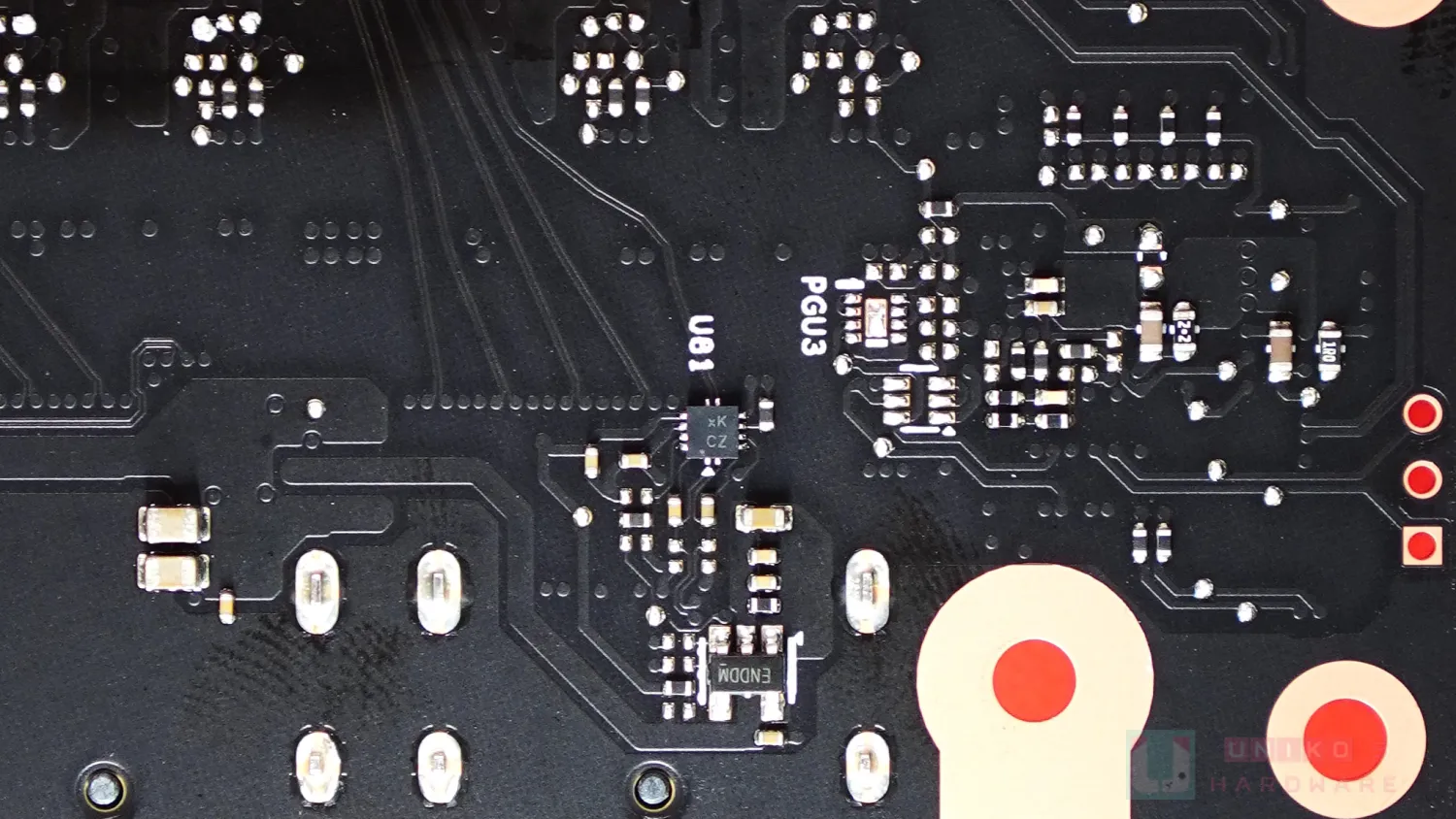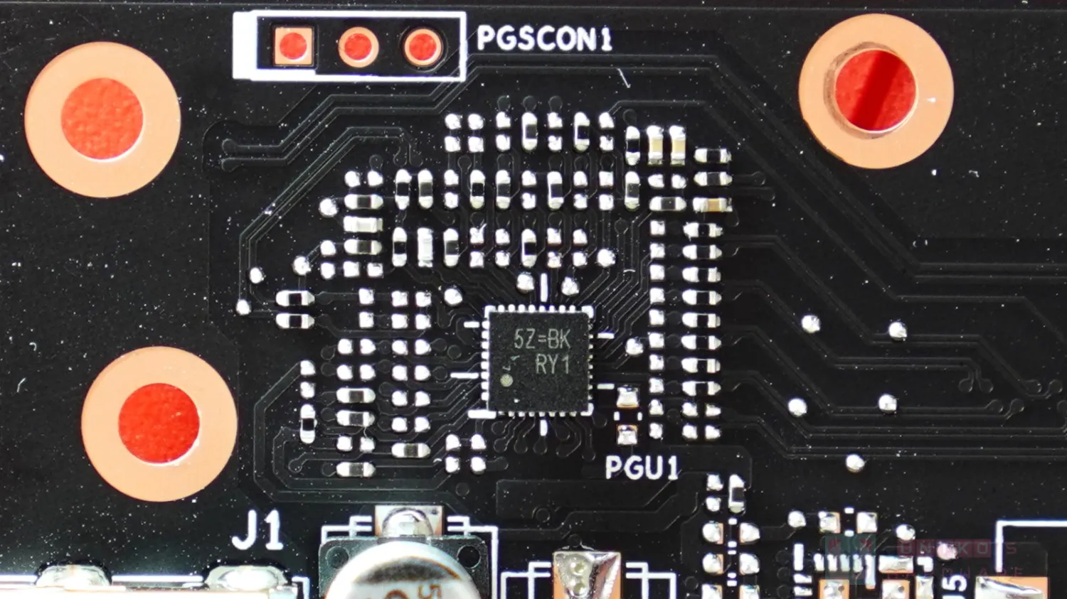 - 在 3 組 DP 輸出旁邊各有 1 顆 XK 晶片 (正面兩顆背面一顆),來自 DIODES PI3AUX221 (xK),負責核心至 DP 輸出。