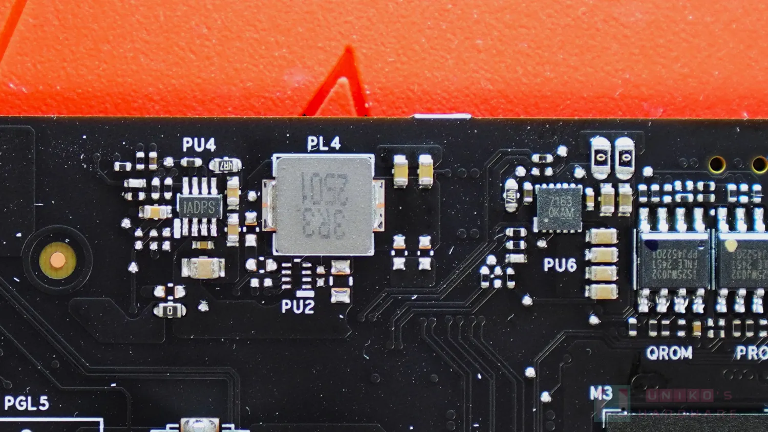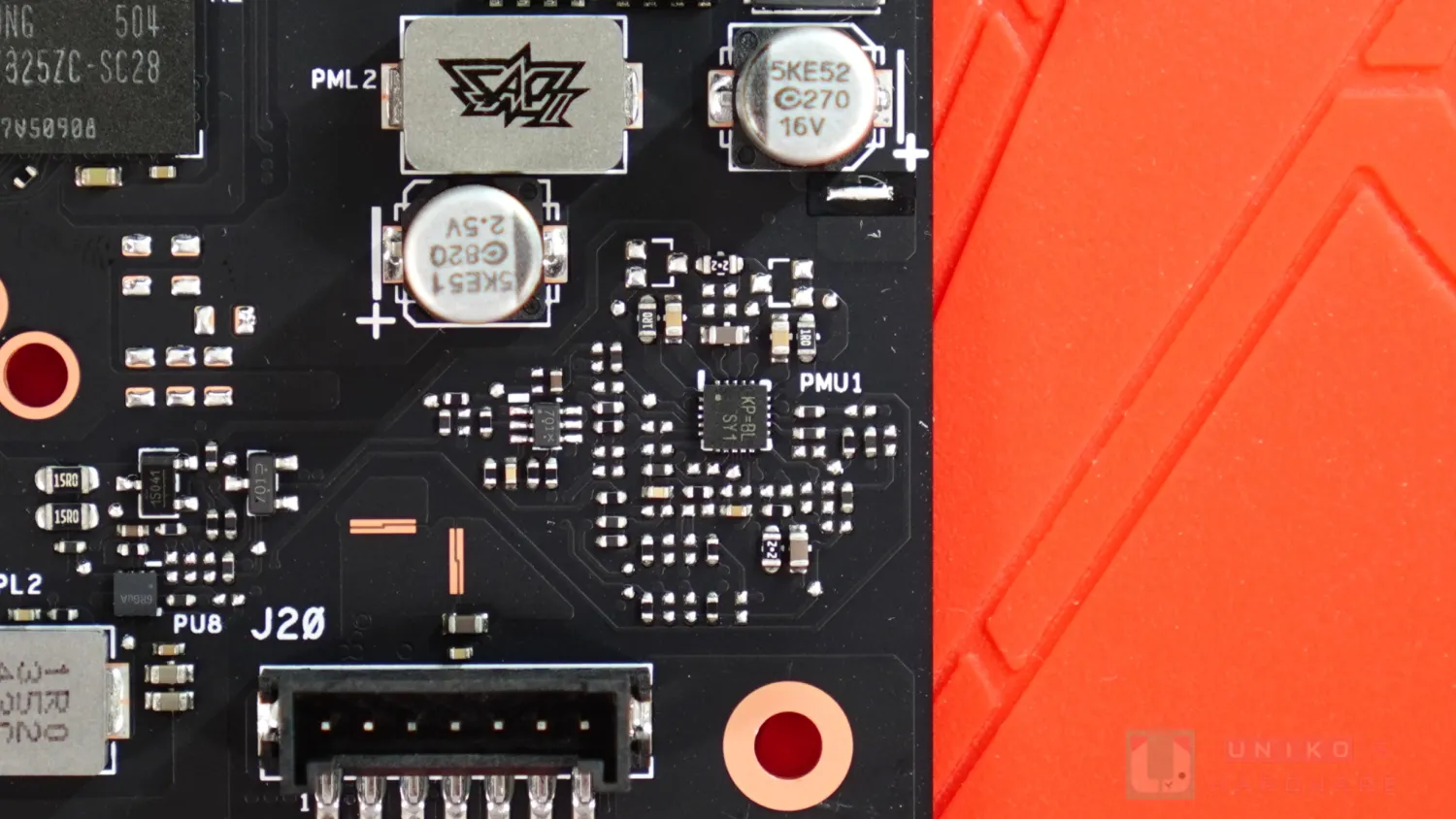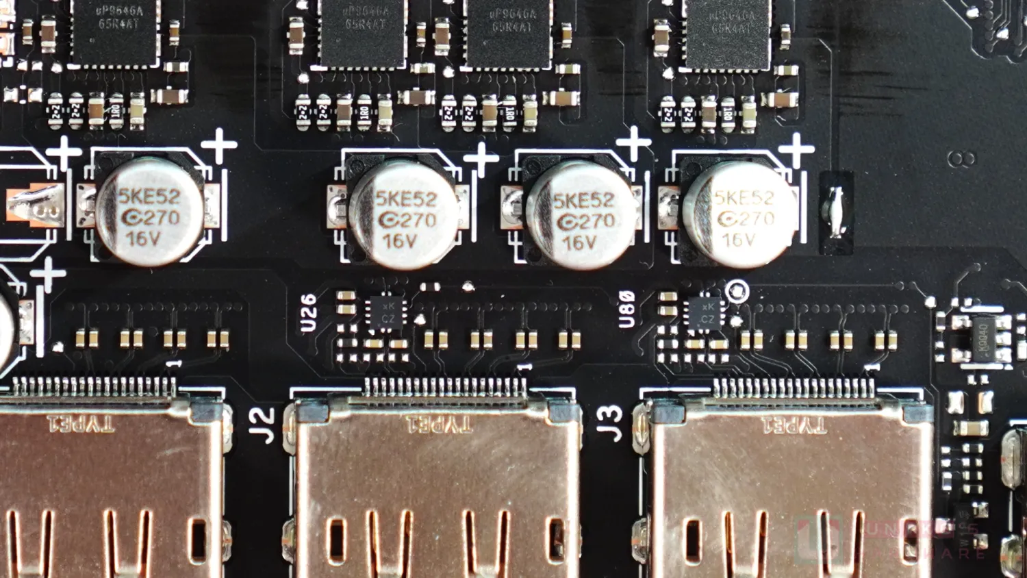 - UPI SEMI UP9646A 50A 一體式供模組,一共四顆負責 NVVDD。在台系鈺邦輸出電容與核心之間,還有不少 MLCC,同樣是輸出電容。