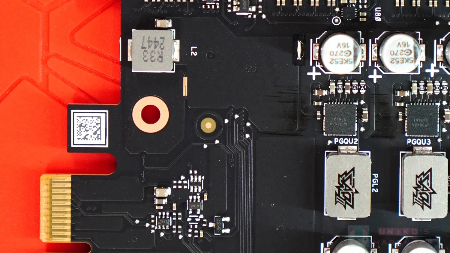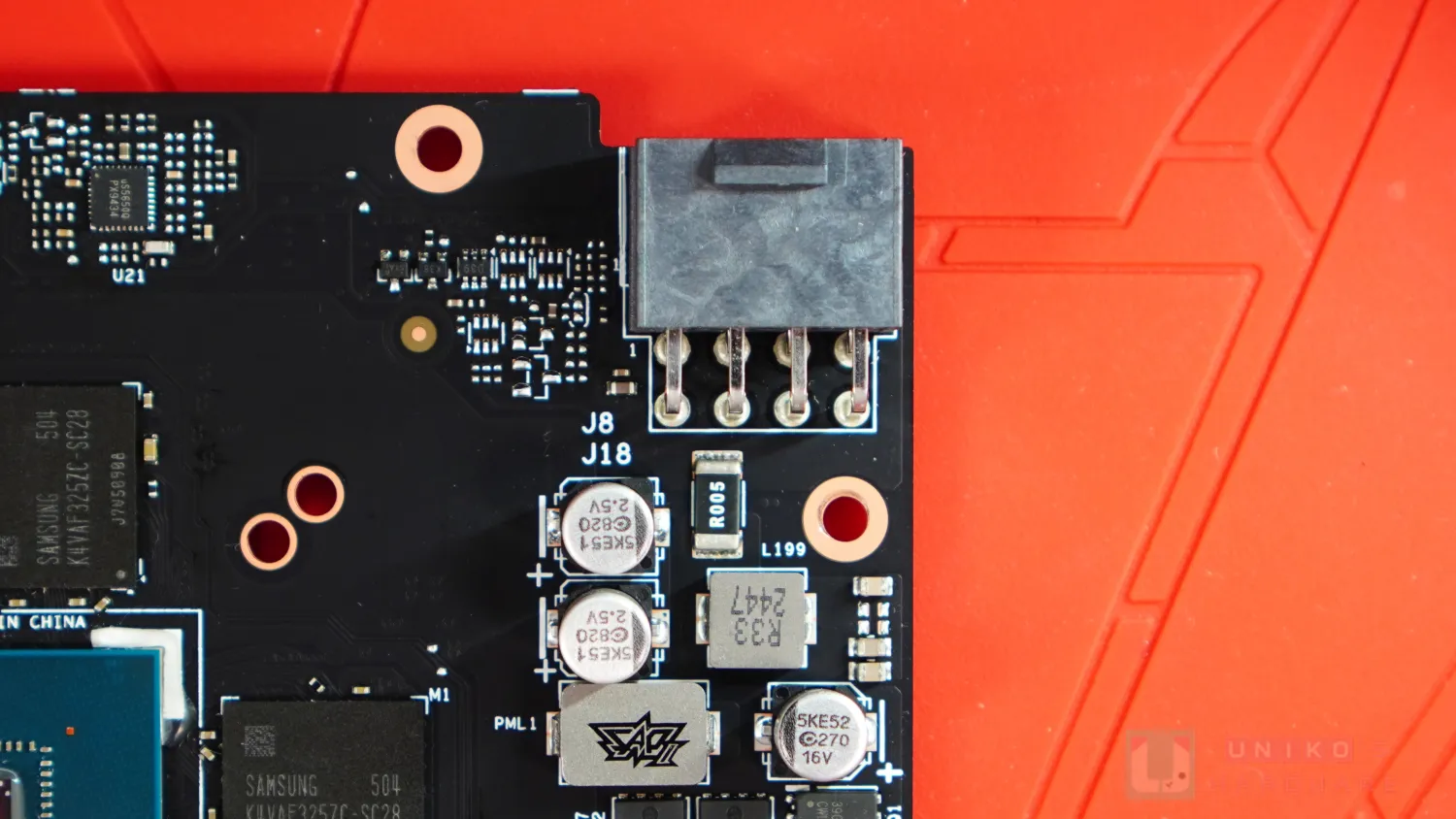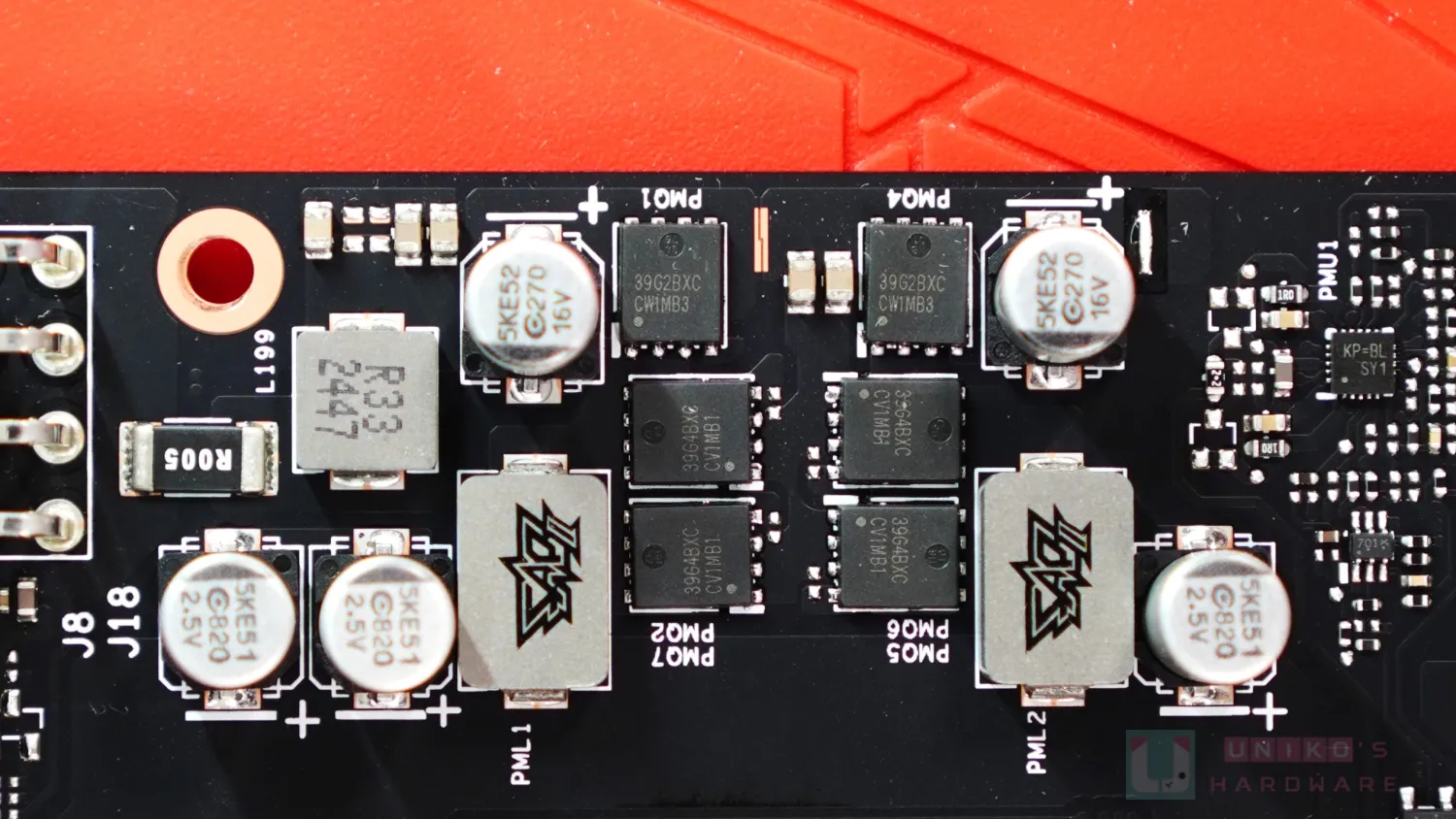 - PCIe 8PIN 之下有一顆 R005 電流檢測電阻,旁邊的 R33 電感是 12V 輸入。