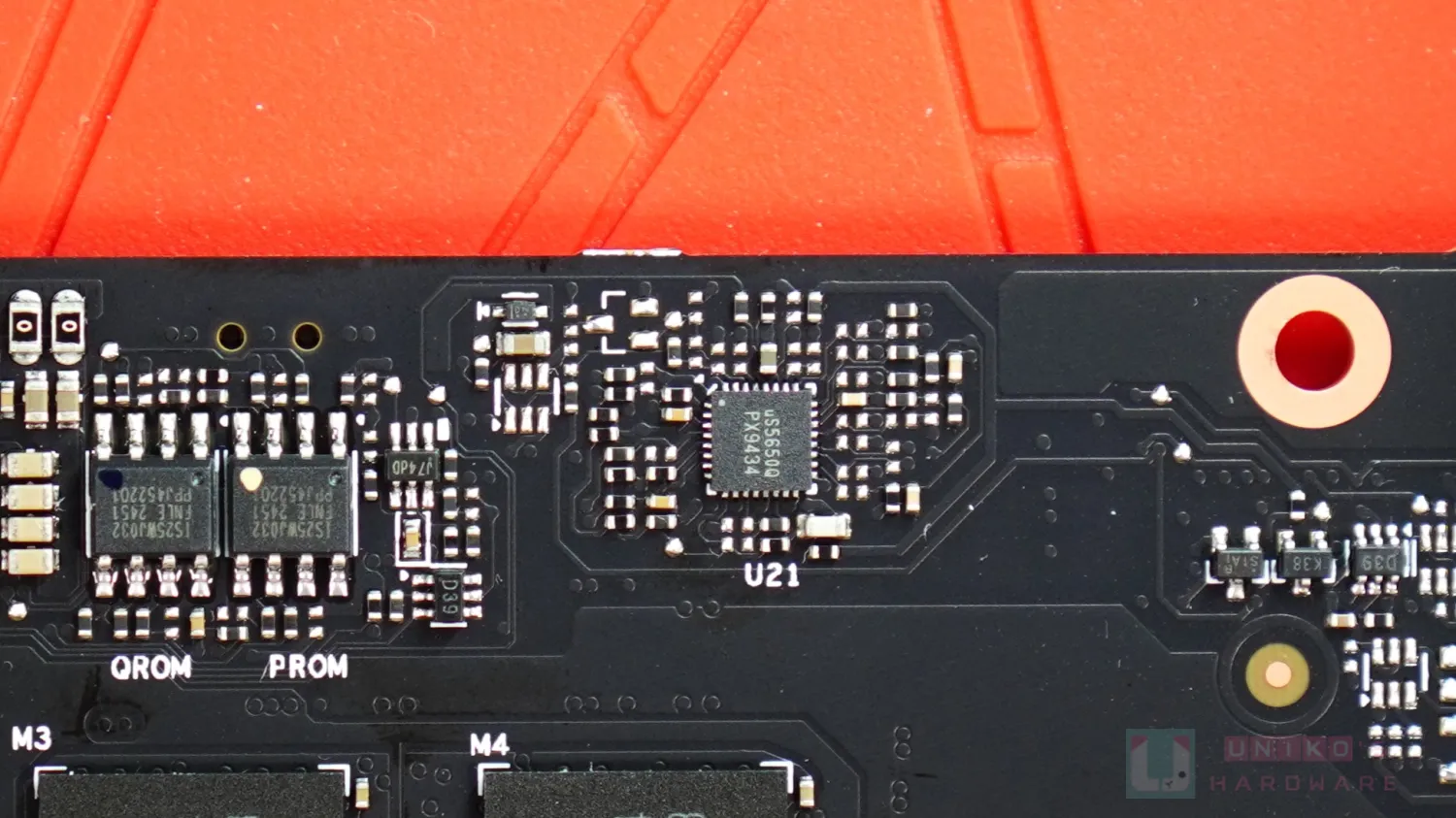 - UPI SEMI US5650Q 電源管理晶片,連接核心執行 BIOS 功率目標,也連接各 12V 輸入的電流檢測電阻。