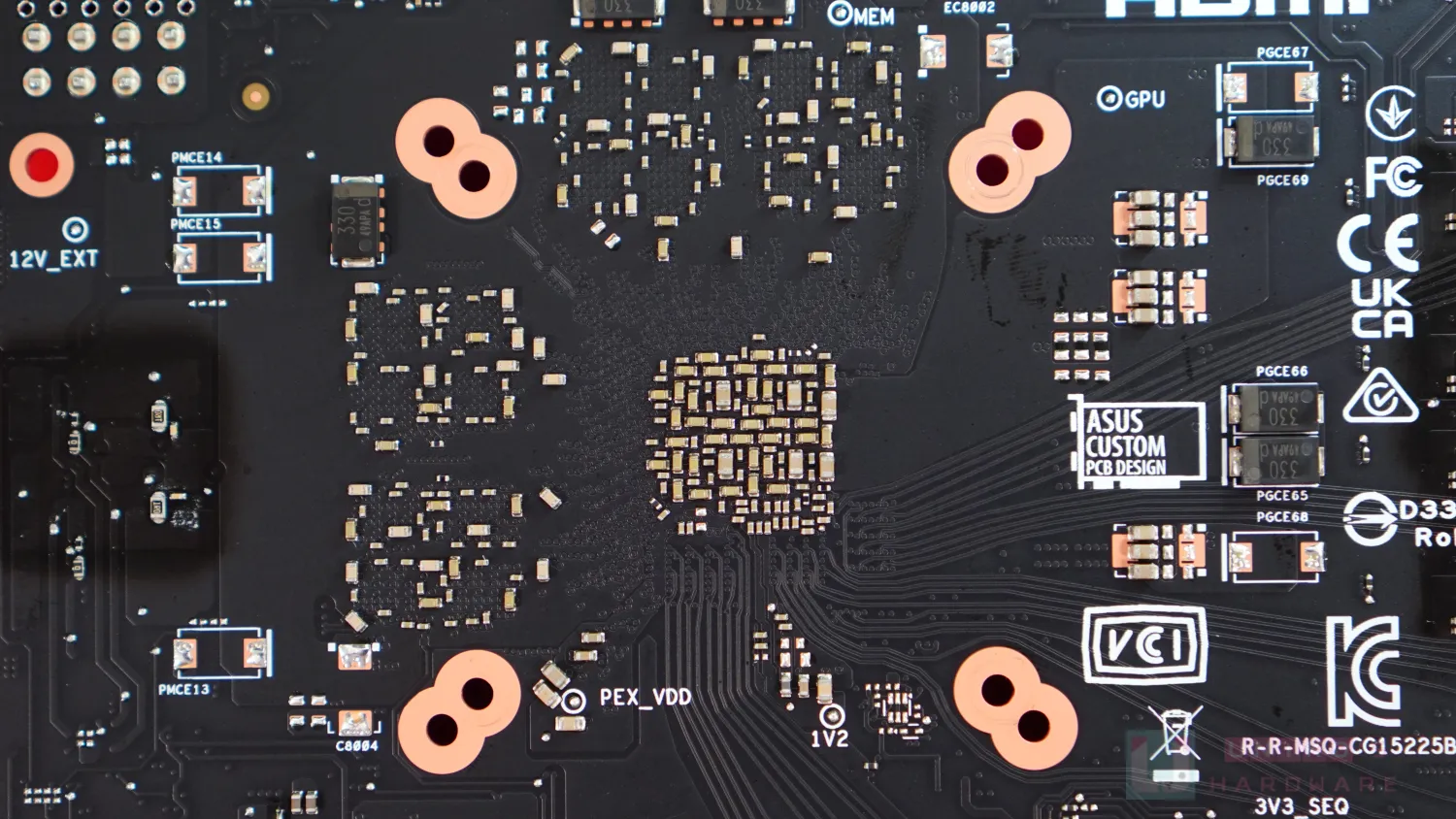 PCB 背面沒有重大晶片,主要以電容為主。華碩非公版設計 ASUS CUSTOM PCB DESIGN 其中一大特色便是 PCB 上有各路供電的測量點,包括 NVVDD (GPU)、MEM (FBVDDQ) 等等。PCB 背面的左上角同時出現 PCIe 8PIN 與 16PIN 的焊接位置,反映 PCB 有 CO-LAY。