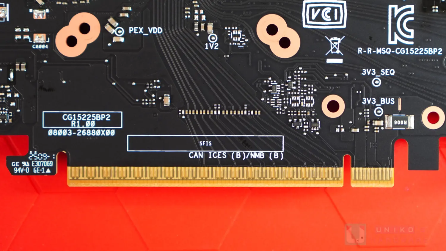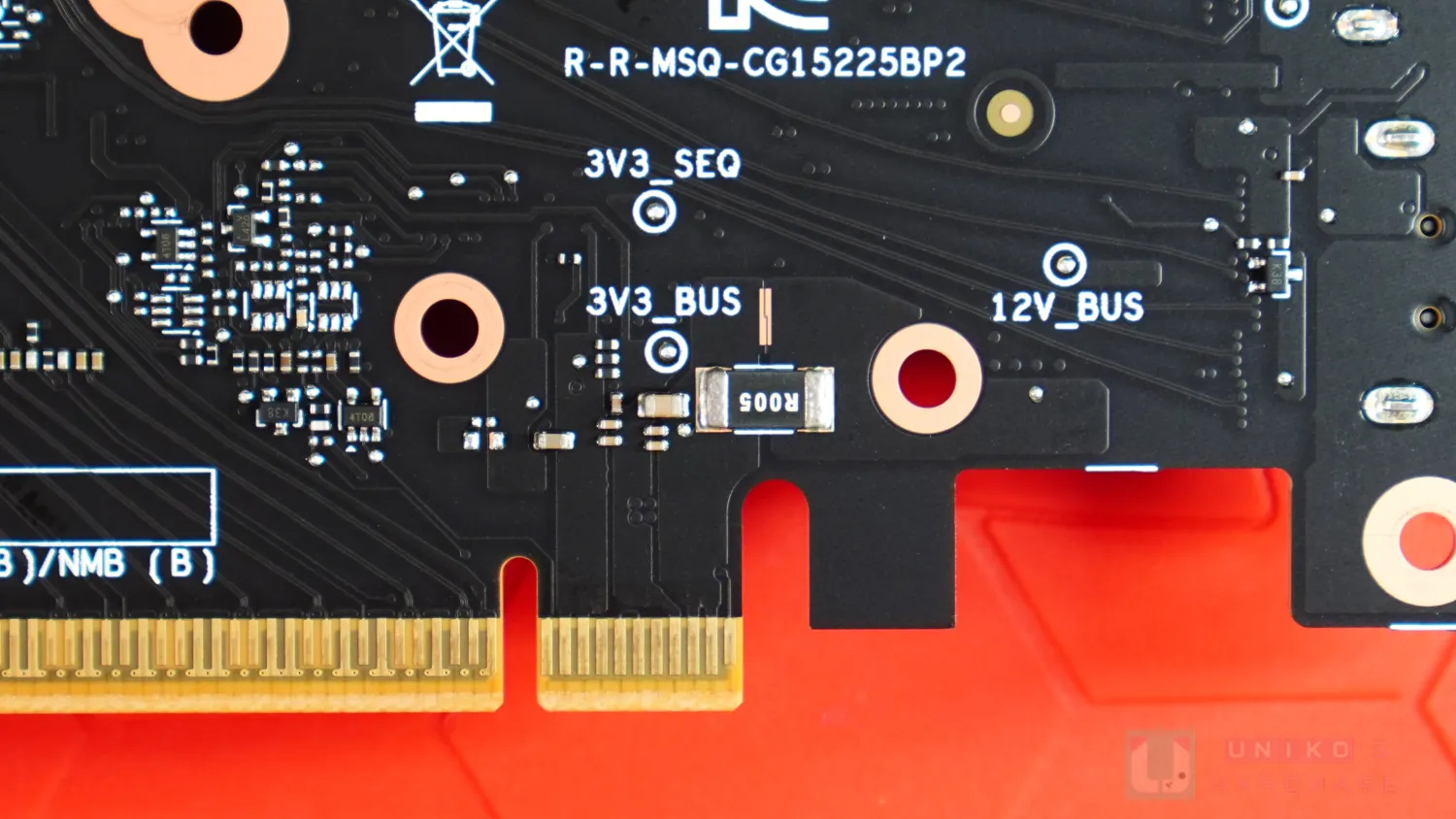 PCB 金手指為物理 X16 完全長度,線路上只由首 X8 接上。在 PCB 背面有 8 組 MLCC,各對應 X1。金手指觸點形狀獨特,為 GEN5 標準形狀,地線較長且與旁邊合併,PCIe 訊號則較短且維持獨立。