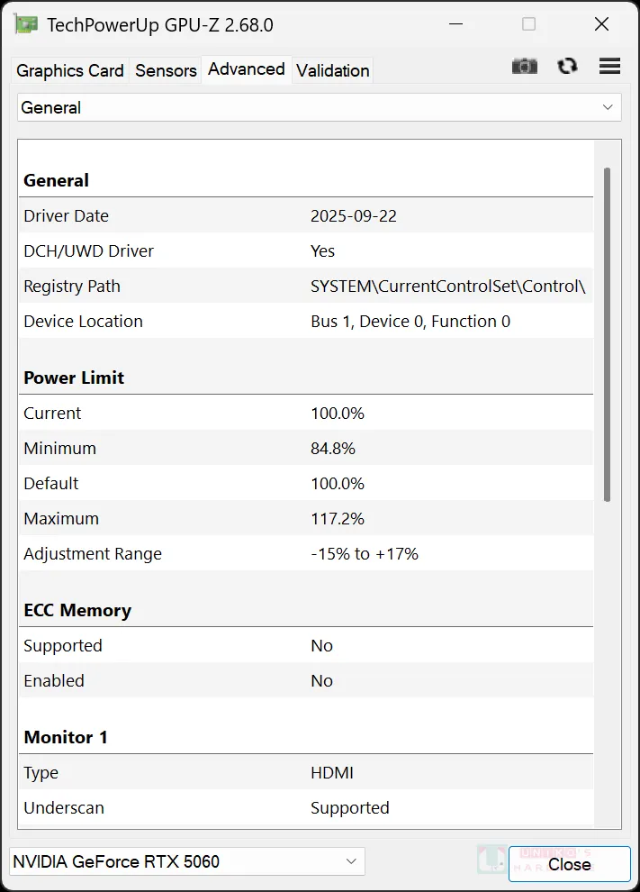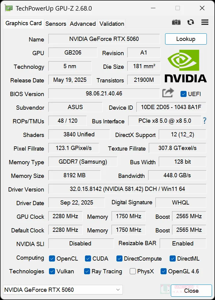 記憶體方面,軟體正確識別所採用的 GDDR7 是 SAMSUNG 產品,8GB 容量對應 128BIT 記憶體位元,G7 頻率為 1750 MHz (28 Gbps),頻寬合共 448 Gbps。核心頻率 GPU CLOCK 是 2280 MHz,BOOST CLOCK 是 2565 MHz。