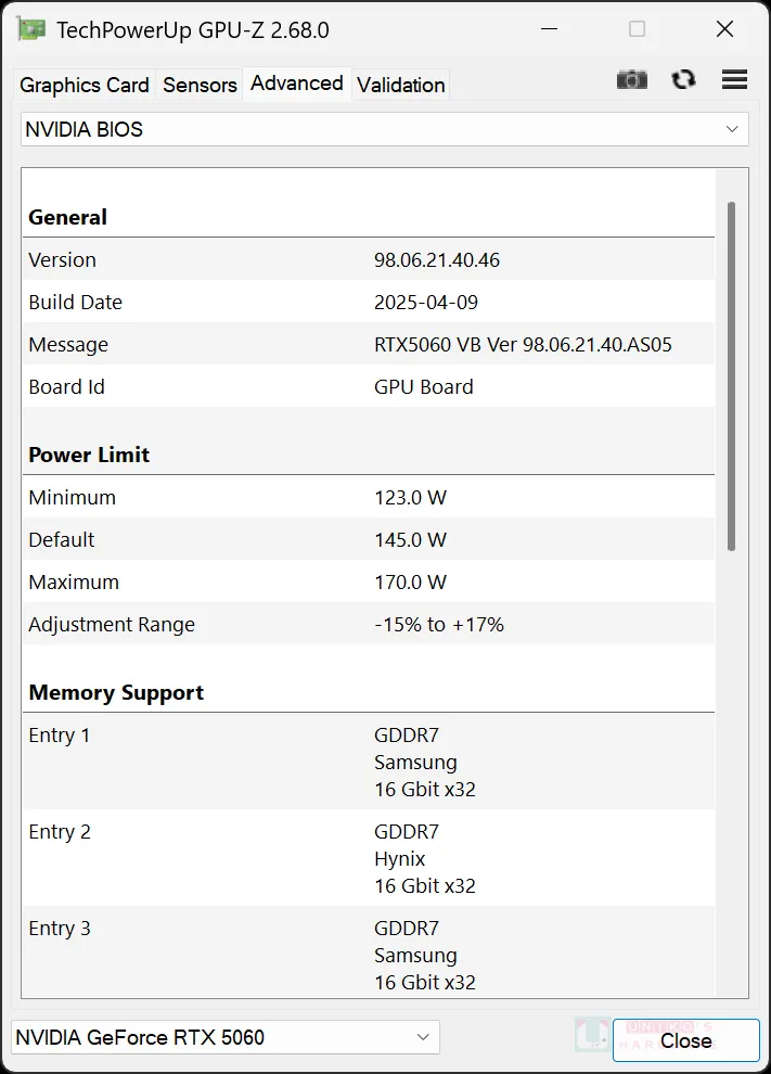 RTX 5060 核心是 GB206-250-A1,支援 128 BIT 記憶體位元。GDDR7 晶片有 4 顆,型號為 SAMSUNG K4VAF325ZC-SC28,單顆容量 2GB,原生速率為 28 Gbps。