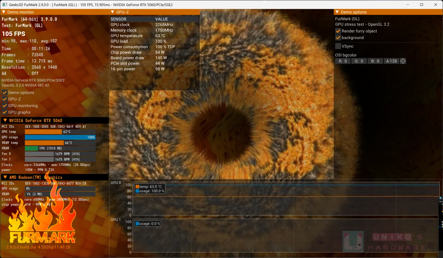 FURMARK 2 以 1440P 0XAA 的場境測試約 10 分鐘,核心溫度為 63 度,轉速約在 1680 RPM,記憶體溫度在 66 度。