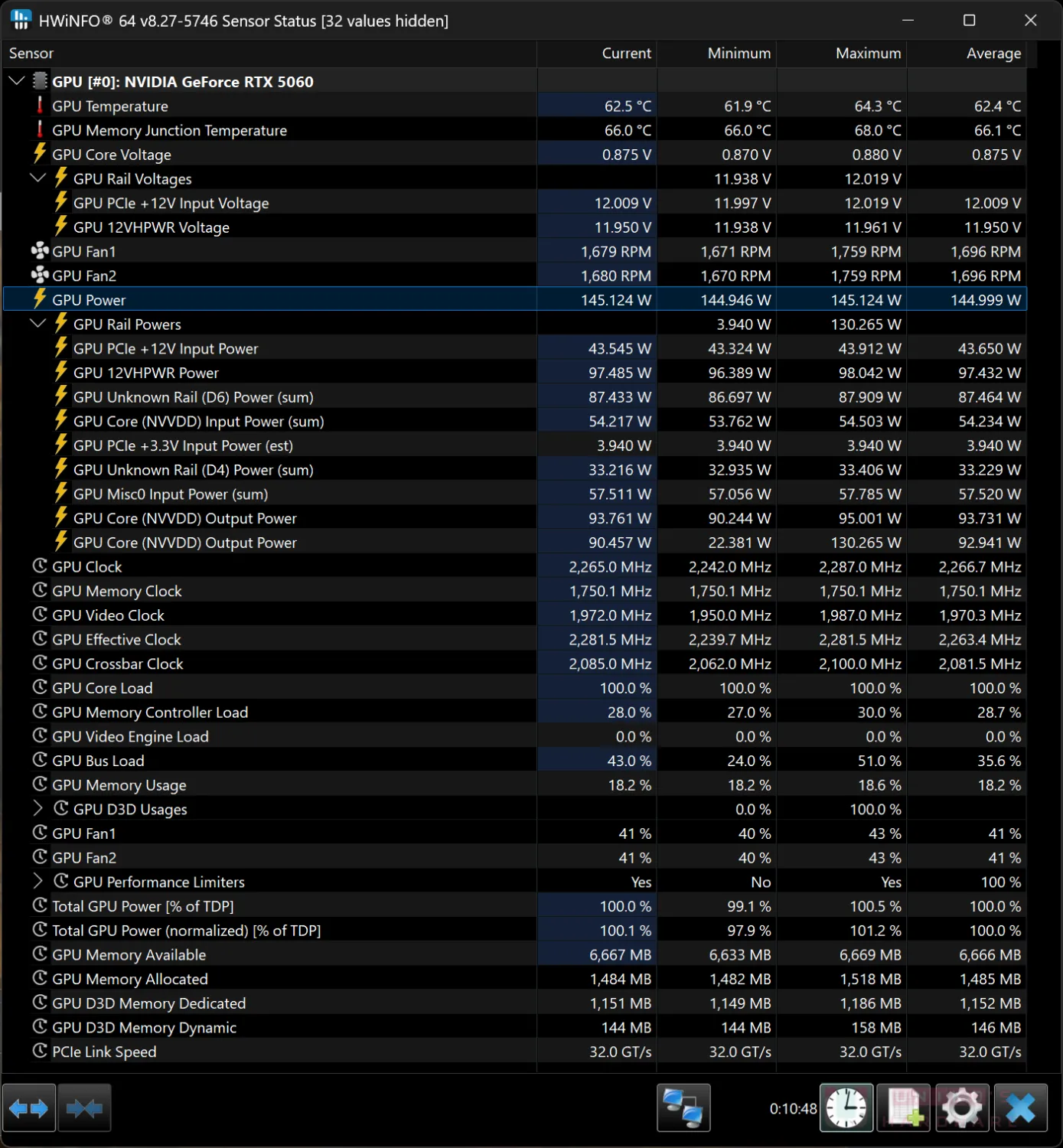 HWINFO 數據顯示,華碩採用雙風扇通道控制三顆風扇,基本上兩組控制的風扇轉速一致。BIOS 目標功率 145W 實際上由 PCIe 8PIN 負責約 100W,PEG 金手指負責約 45W。