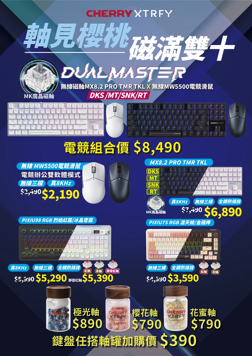 2025 年 9 月,CHERRY 以「軸見櫻桃 磁滿雙十」為主題,不僅推出 MX8.2 PRO TMR × MW5500 DualMaster 磁力組合優惠,更祭出 PIXIU 98 / 75 三模系列降價回饋,加上全新 MX2A 軸罐「櫻花軸、蜂蜜軸、極光軸」,讓玩家從鍵盤、滑鼠到軸體一次升級,享受德國工藝帶來的極致體驗。