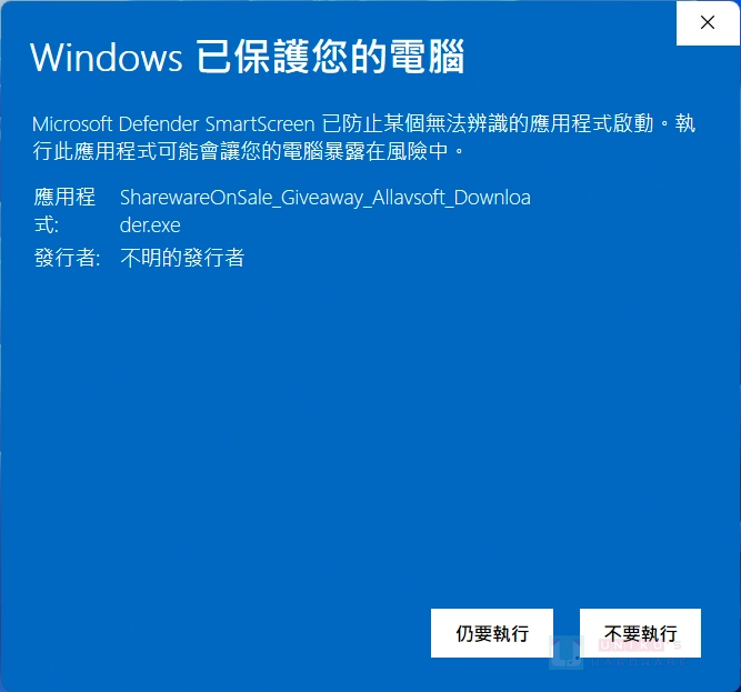 下載後執行安裝檔,如果出現「Windows 已保護您的電腦」,先按其他資訊接著按「仍要執行」。