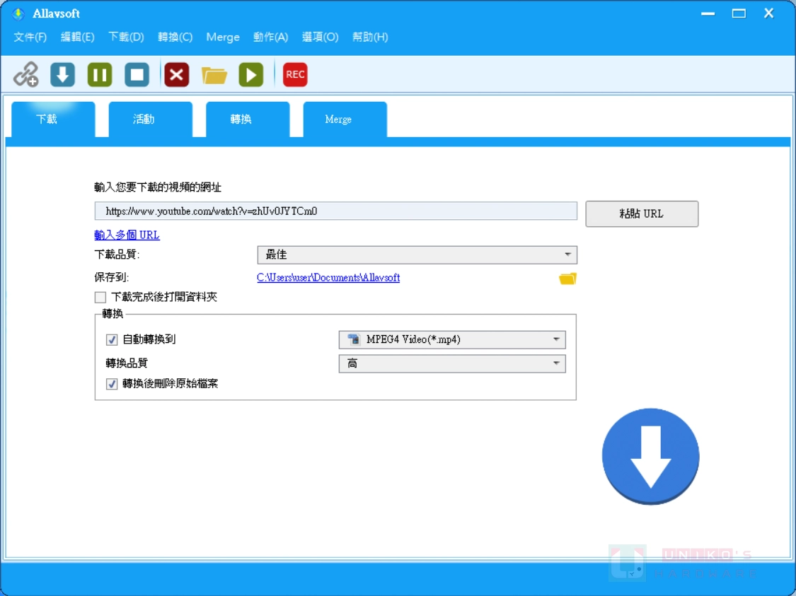筆者以 YouTube 做示範,先複製影片網址,然後貼到 Allavsoft Downloader 內,如果你想要軟體自動轉換格式 (MP4、MP3),則勾選自動轉換到,然後選擇目標檔案格式,接著按旁邊的 ↓ 箭頭圖示。