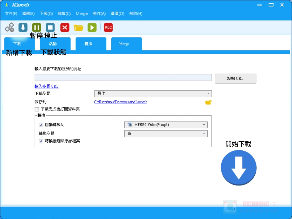 主畫面介面算是蠻容易瞭解的,按「下載」用來指定來源網址,「活動」可觀看影音下載狀態,上方的「暫停」和「停止」圖示則控制下載作業的暫停或停止,而保存到的路徑就是下載後影片存放的路徑,預設位於 C:\Users\使用者名稱\Documents (文件) 內,下載完的在 Download,轉檔後的在 Convert。