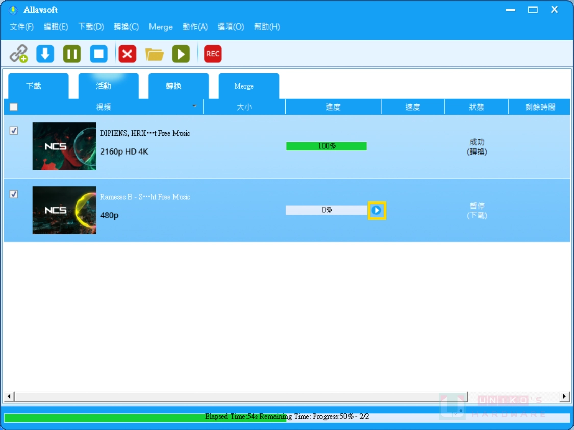 暫停或停止的下載作業,只需要在進度旁的播放圖示按一下,就能繼續下載。