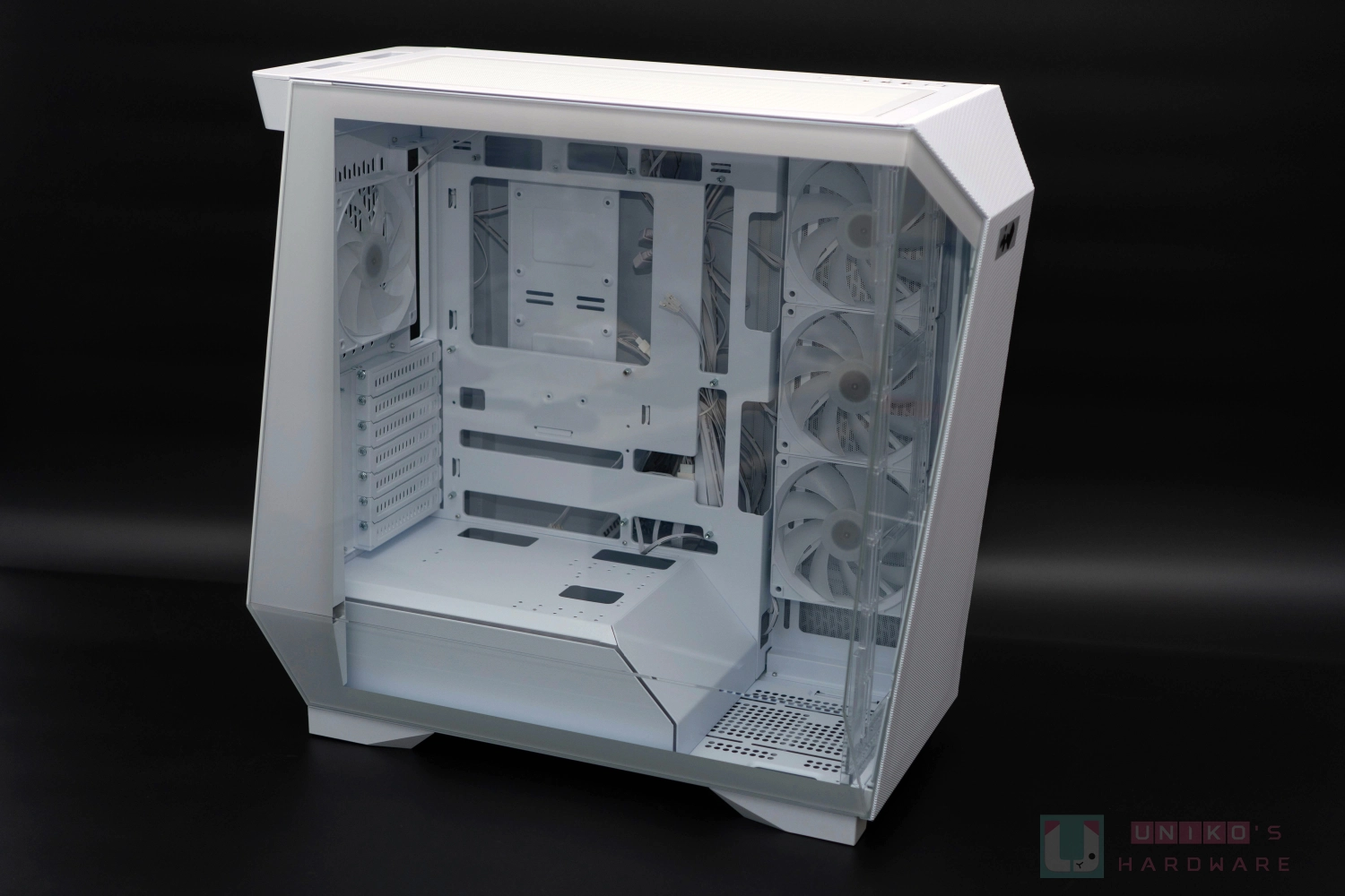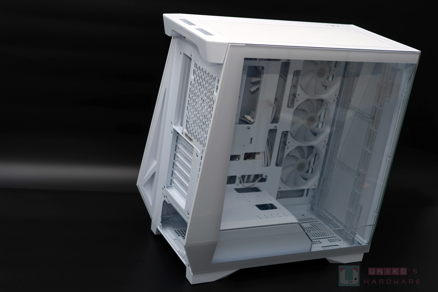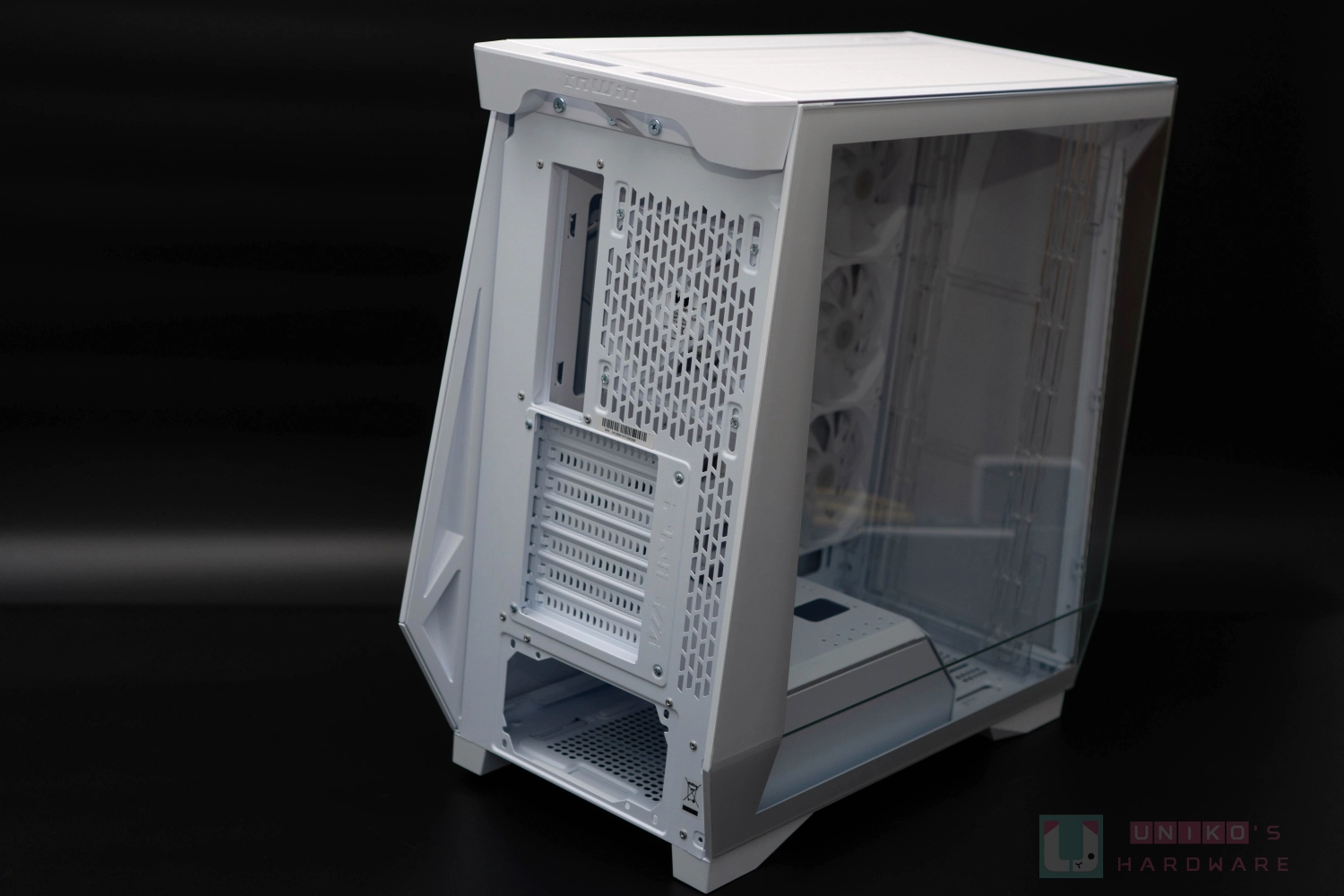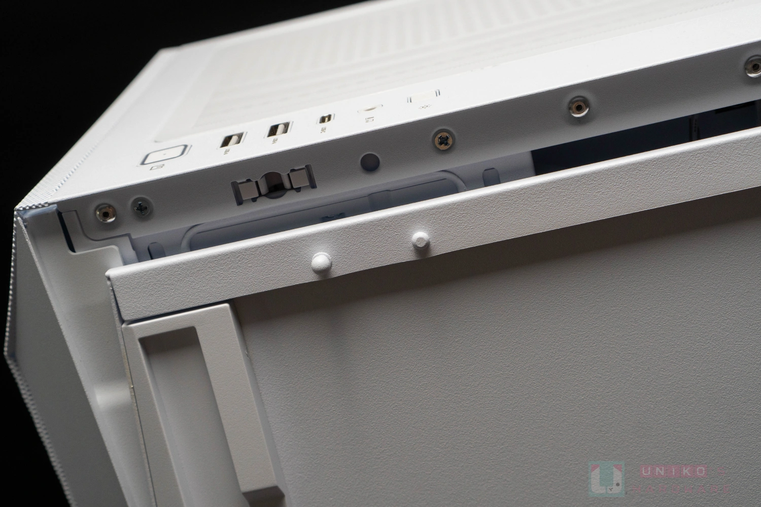 視覺方面,最大特點自然是側面的三片無縫拼接設計玻璃面板,裝機完成後的透視感相當優秀。此外,其稜角分明的線條風格和後方的尾翼手把設計,也在科技的硬派線條中引出時尚質感,尤其白色款呈現一種淡雅風,搭配現代化外觀零組件,彼此搭配後形成的巧妙平衡,或許就是迎廣想傳達的效果。
