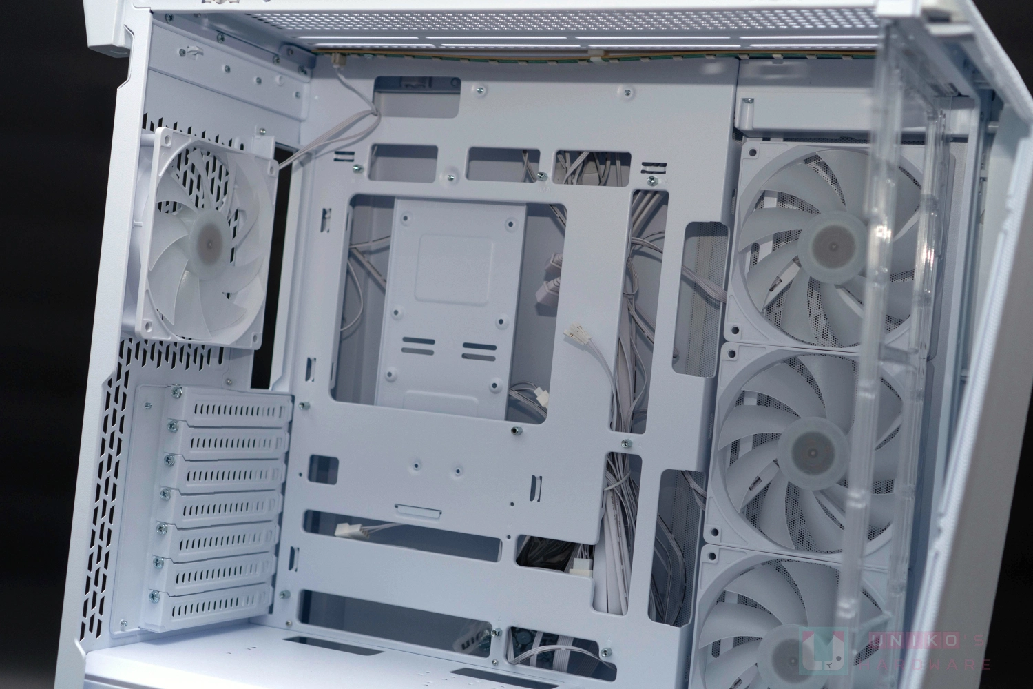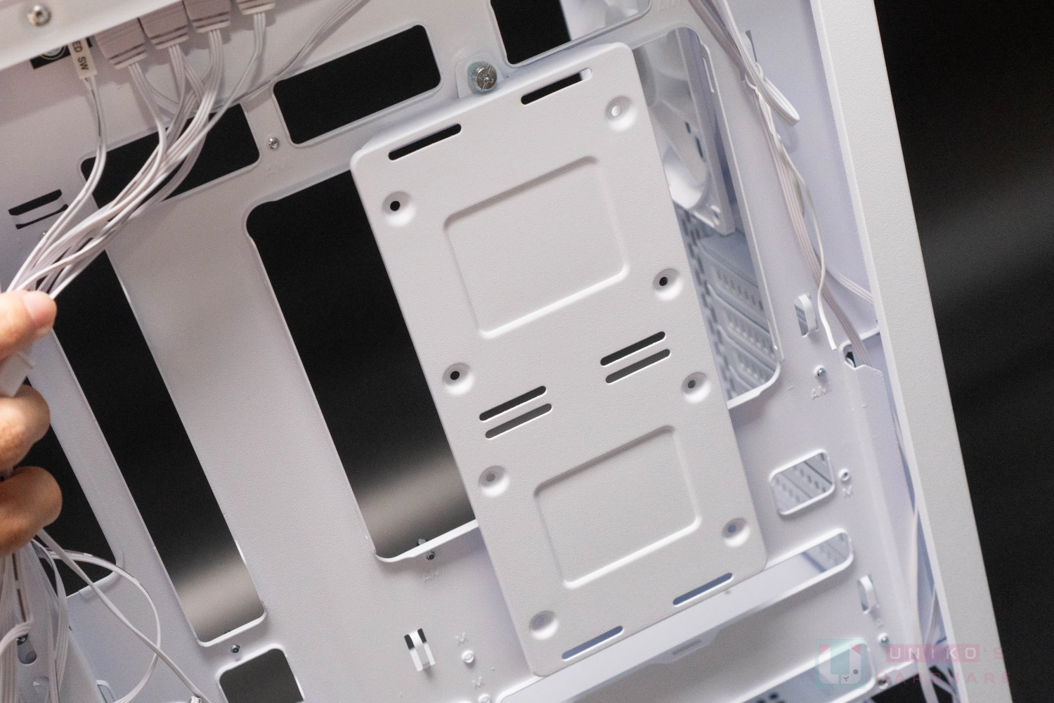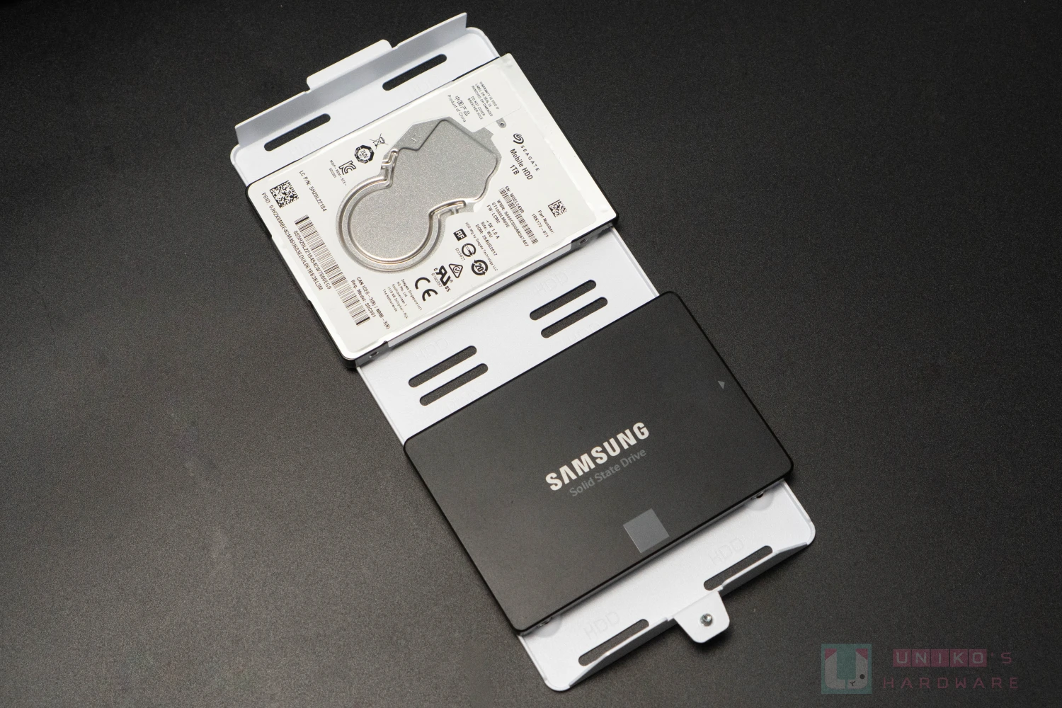 硬碟架都能安裝硬碟,其中貼近主機板後方的那面可安裝兩顆 2.5” SSD / HDD,另一面則是最多可安裝兩顆 3.5” HDD,可自行根據需求調整。