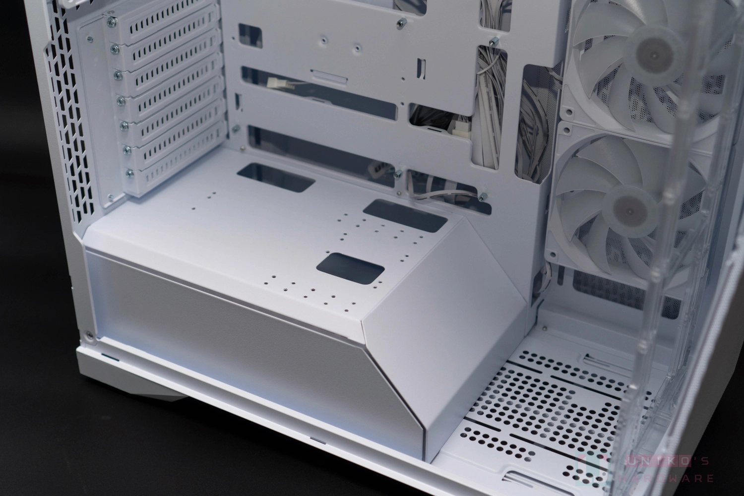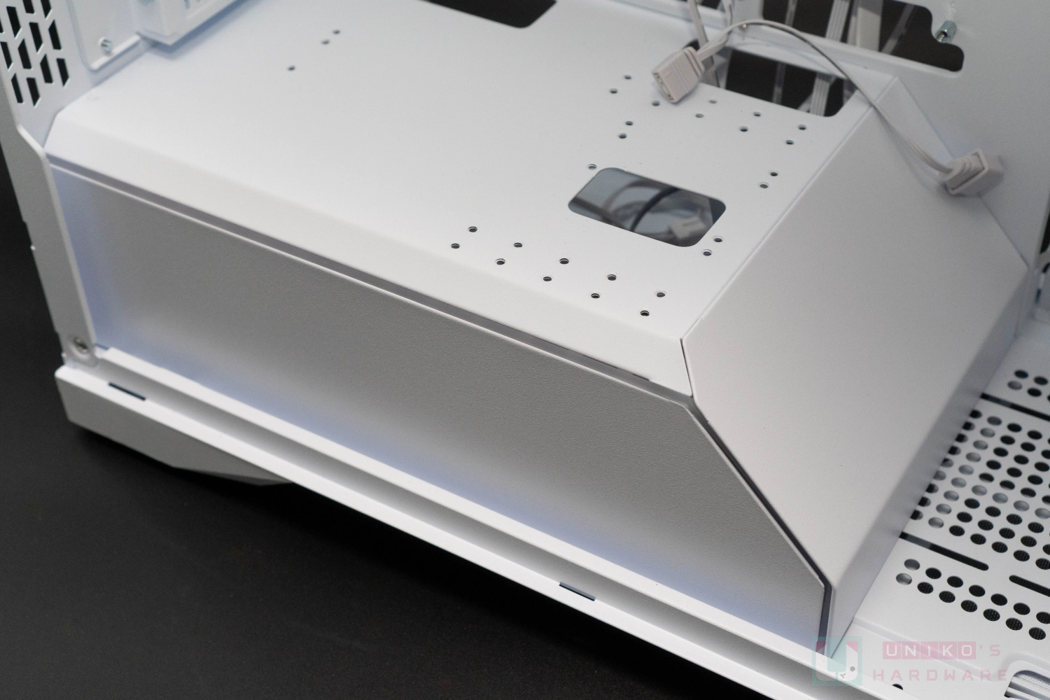 電源艙的部分有額外遮罩保護,視覺上看起來會更乾淨些。其前方採用斜面的設計,使得前方氣流更容易抵達機身後方,進而帶給顯示卡更好的進氣導流效果。