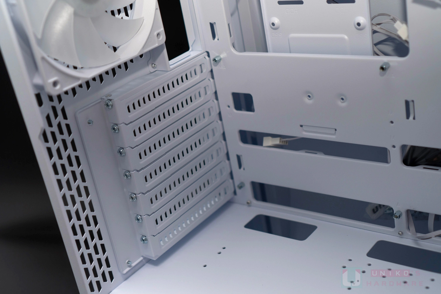 機身後方整體為標準的空間配置,主機板 I/O 和後置散熱風口,下方為 PCIe 插槽和 ATX 電供位置。