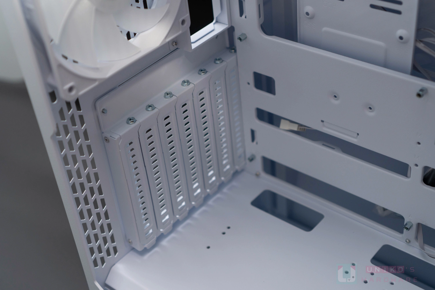 另外,顯示卡 PCIe 插槽提供常見的 7 槽寬,它也能整組直接拆卸後旋轉 90°,達到顯示卡垂直安裝的設計,不過要垂直安裝的話需另購 PCIe 延長線。