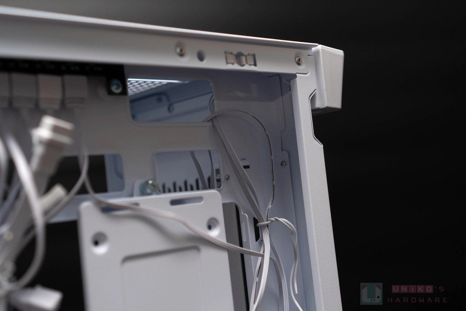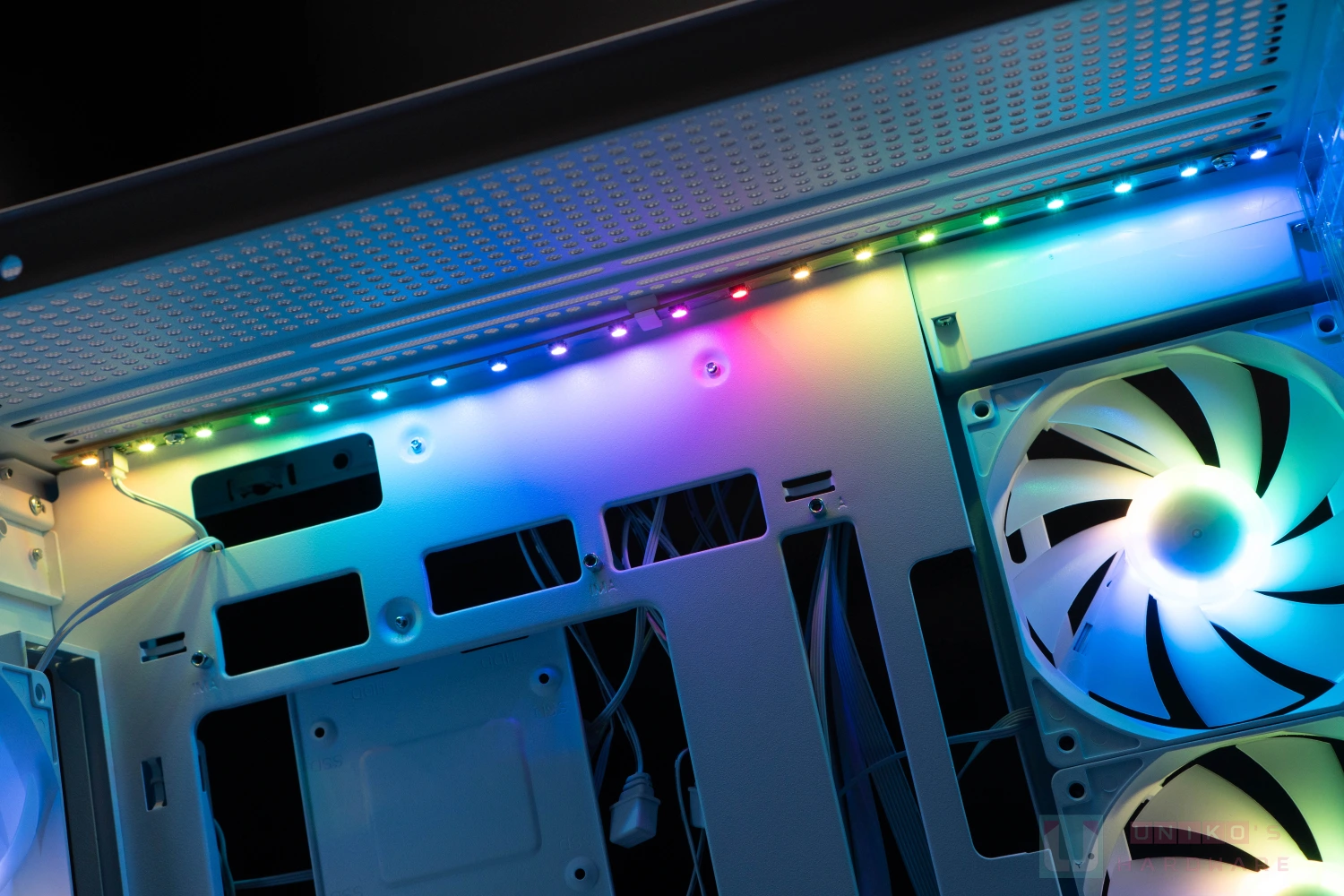 機殼上方內建 ARGB 集線器,共可支援 6 組 ARGB 燈效元件,並且已經預先針對已安裝的風扇做好線材串接,剩餘 2 組讓玩家自行依需求使用。