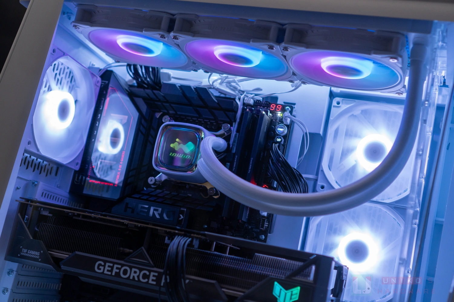 InWin AR36 水冷的燈效和機殼風扇燈光相互呼應,其冷頭具備無限鏡面效果,全白的機身完全融入白色機殼內,若使用白色零組件一體感更好。