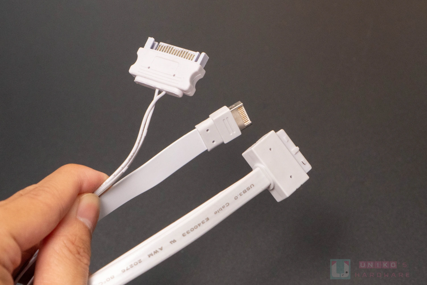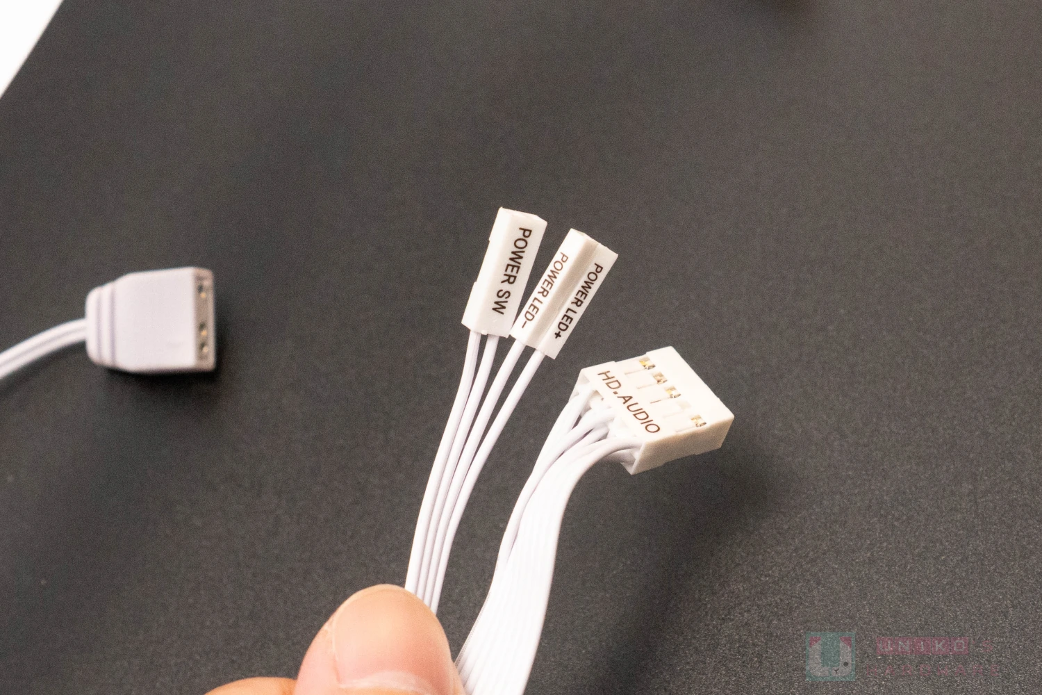 機殼 I/O 線材包含 POWER SW、POWER LED+/-、HD AUDIO、ARGB 集線器所需的 SATA 電源連接埠、以及前置 Type-C 和 USB 線材。