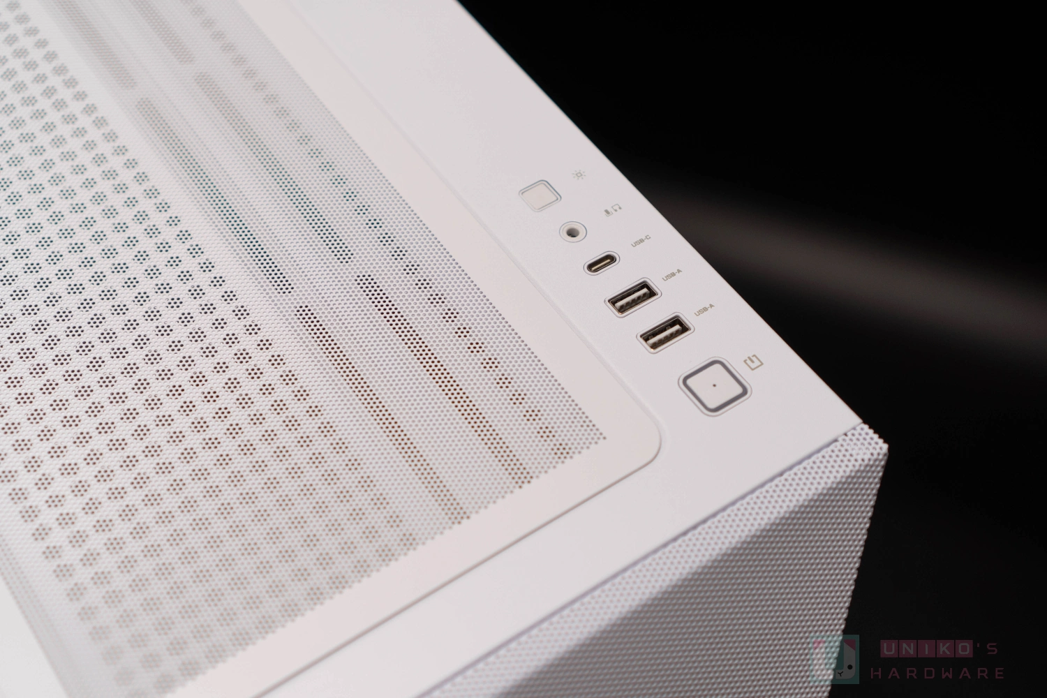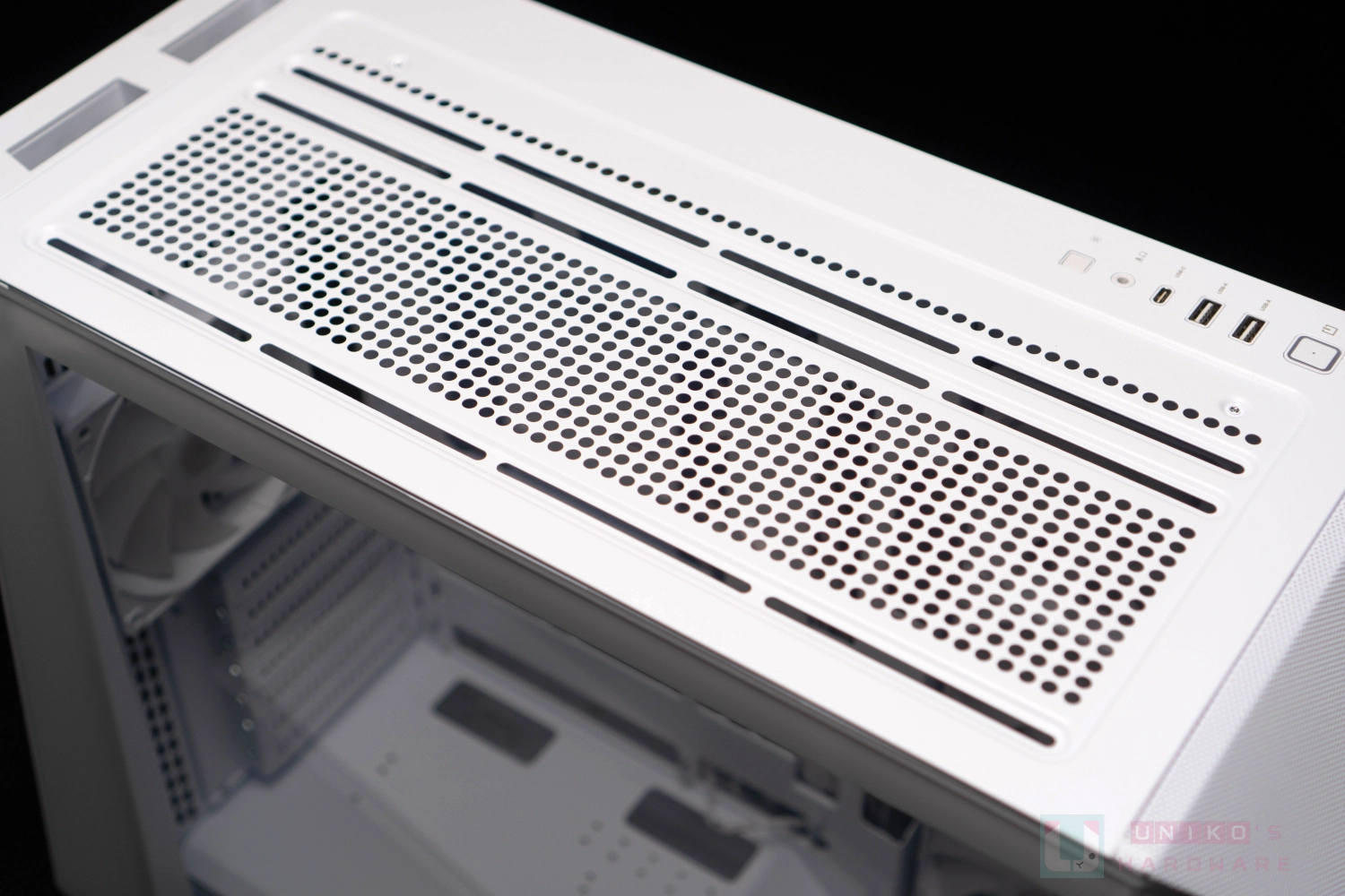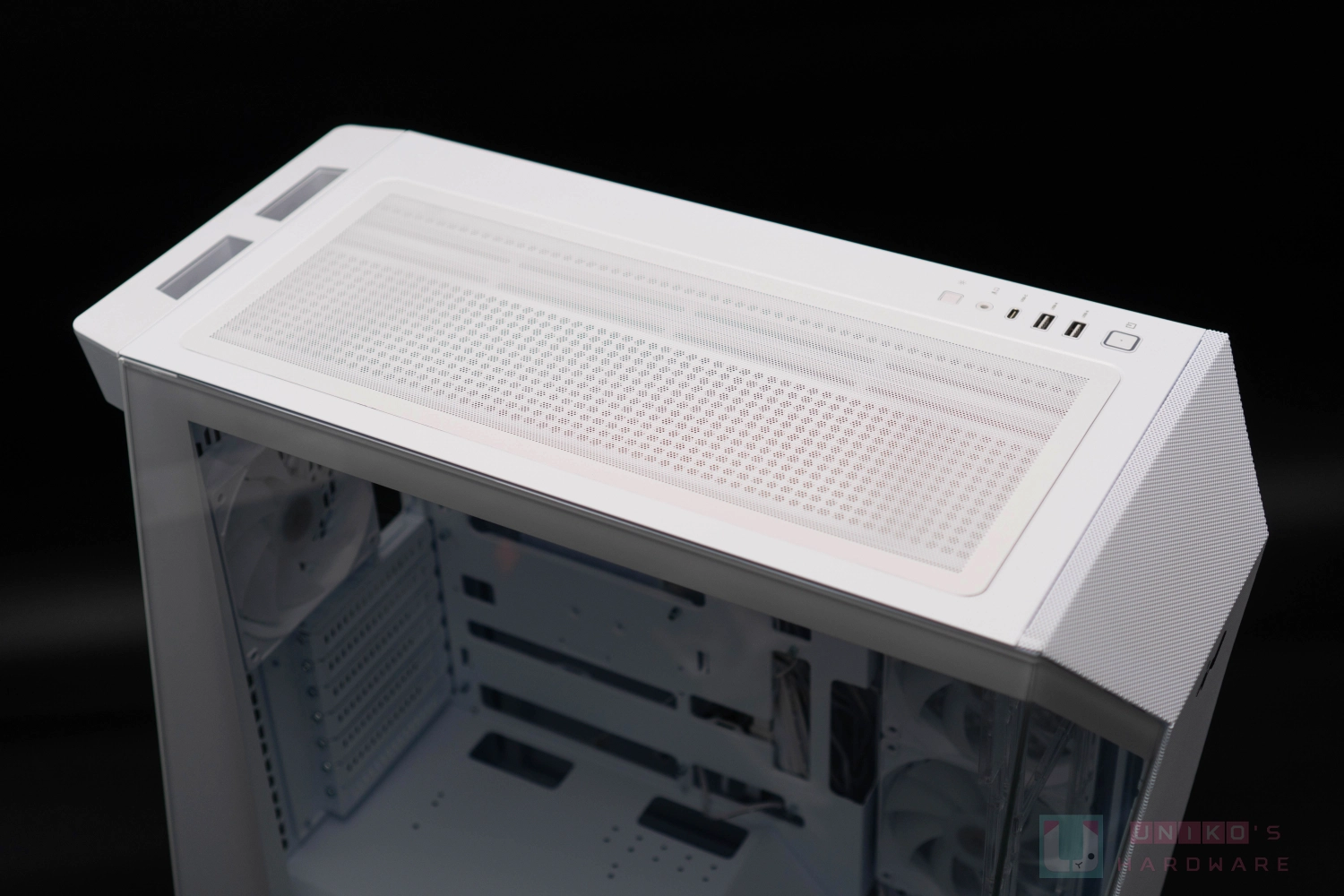 前置 I/O 同樣集中於機身上方,由右至左為電源開關、USB 3.2 Gen 1 Type-A 兩組、USB 3.2 Gen 2x2 Type-C 一組、3.5 mm 耳麥孔和 LED 燈效切換鍵,使用彈性相當足夠。