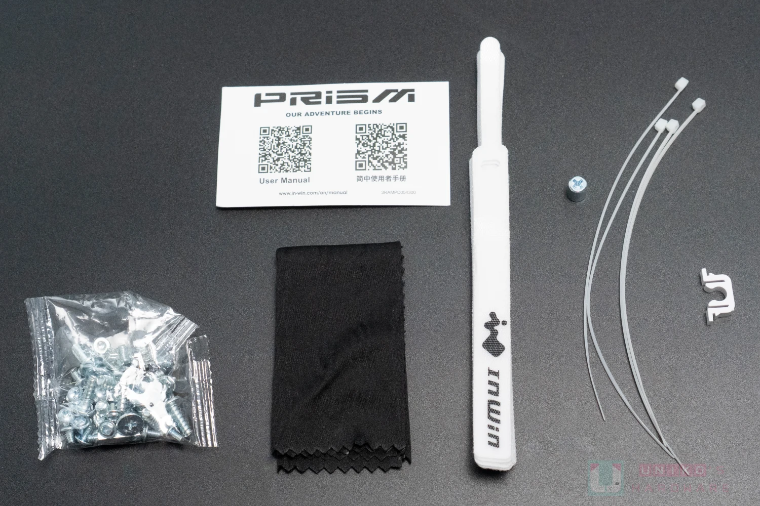 配件包內容除了常用的螺絲外,另有提供機殼說明 QR Code、擦拭布、魔鬼氈、束帶、機殼銅柱套筒和可更換的面板卡榫。