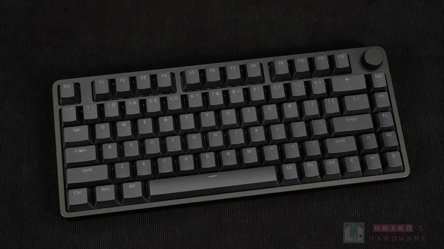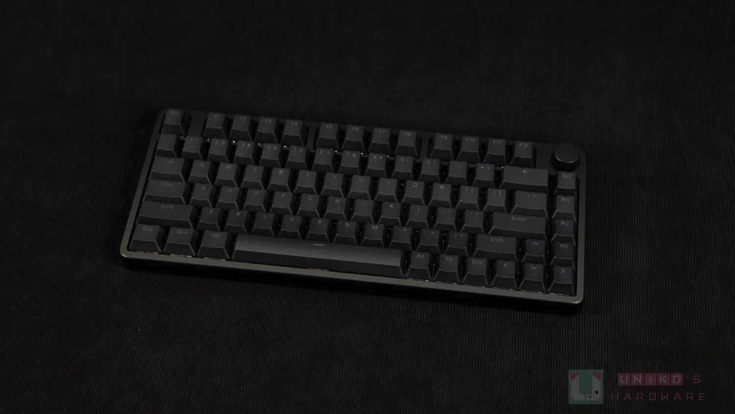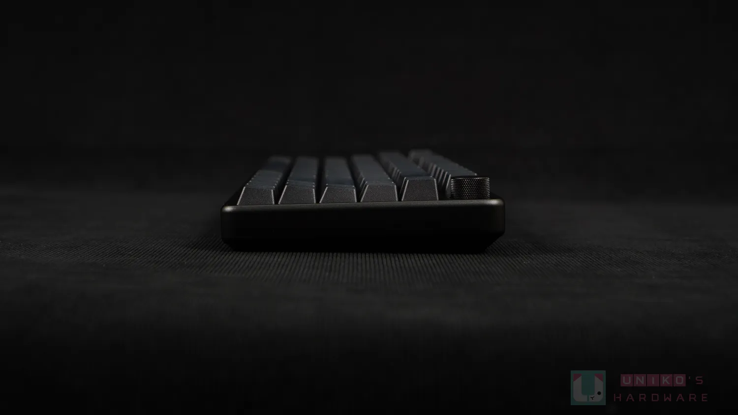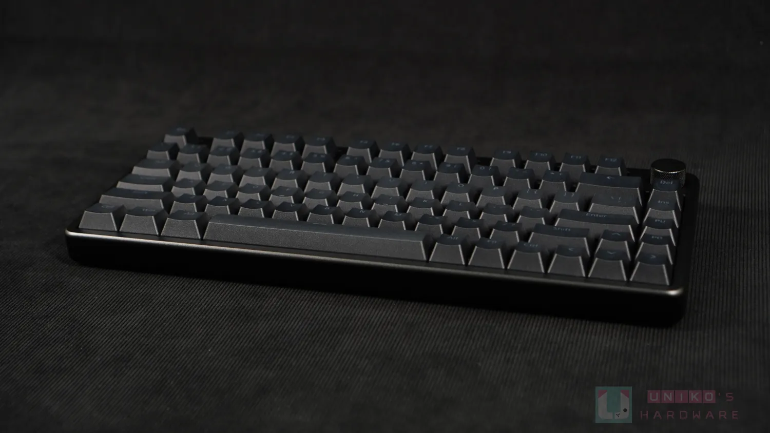來看鍵盤本身,鍵盤本體採用 CNC 加工鋁材質外殼打造,純黑的外觀相當低調。鍵盤實際尺寸約為 318.8 × 37.5 × 132.3 mm、重量約 810g,採用 75% 按鍵佈局,並將常用的文書鍵移至最右邊並切齊方向鍵,文書鍵包含 Del、Ins、Page UP、Page Down。