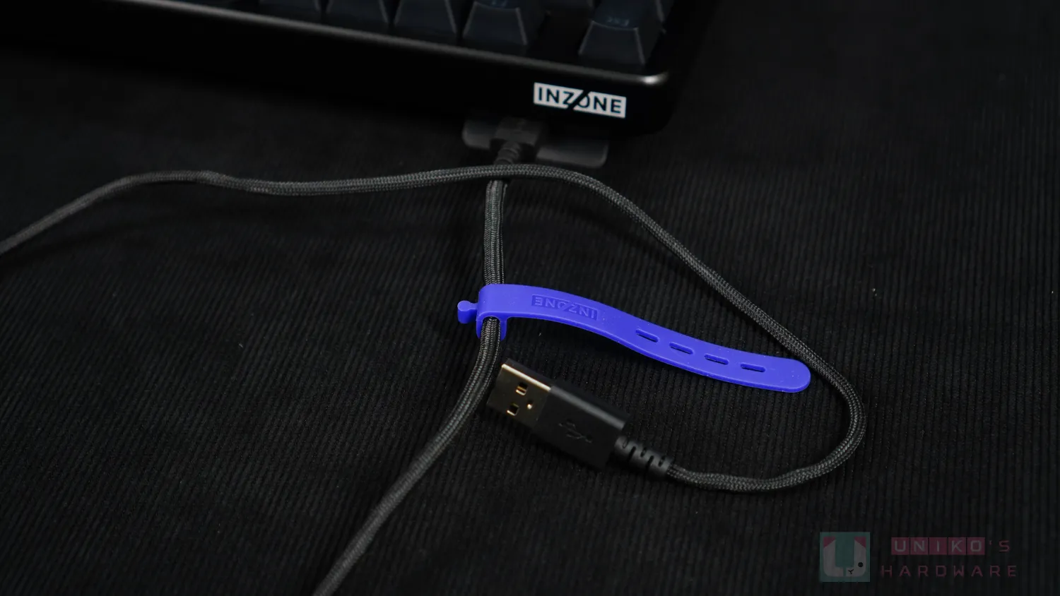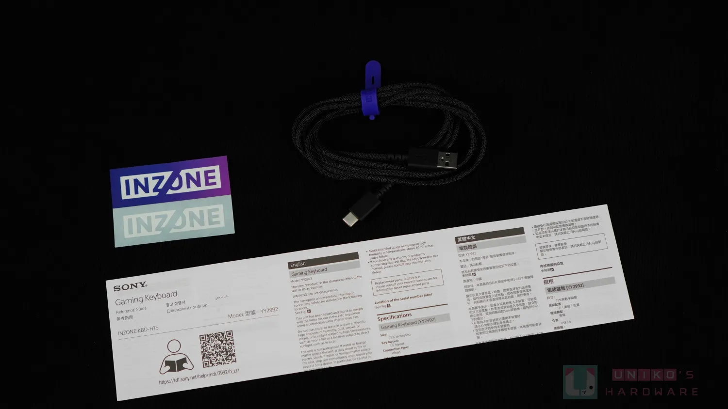 包裝內的鍵盤本體以絨布收納,在鍵盤上方的是 USB Type A-to-C 的連接線,拿起鍵盤後會看到在下方的參考指南以及兩張 INZONE 的信仰貼紙。