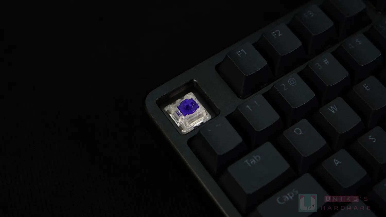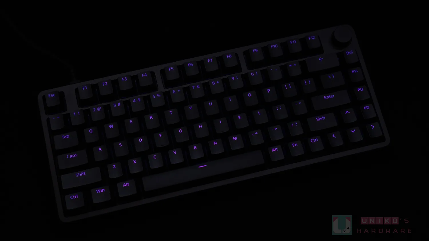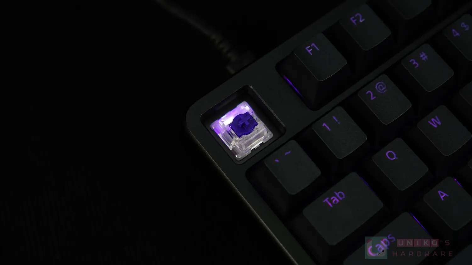 KBD-H75 採用磁軸軸體,軸體觸發行程可以在 0.1 ~ 3.4 mm 之間做調整。鍵帽為英刻雙色 PBT 磨砂材質,摸起來的手感相當不錯。軸體具有雙軌穩定器保持按鍵的穩定性,並且在內部鋁材質定位板上下使用了減震軟墊,吸收震動使其具有著更柔軟順暢的觸感。