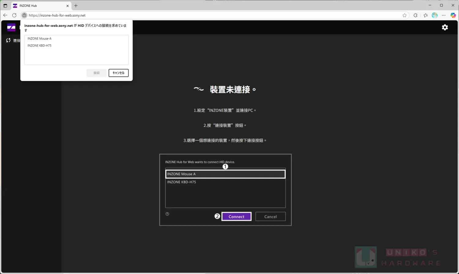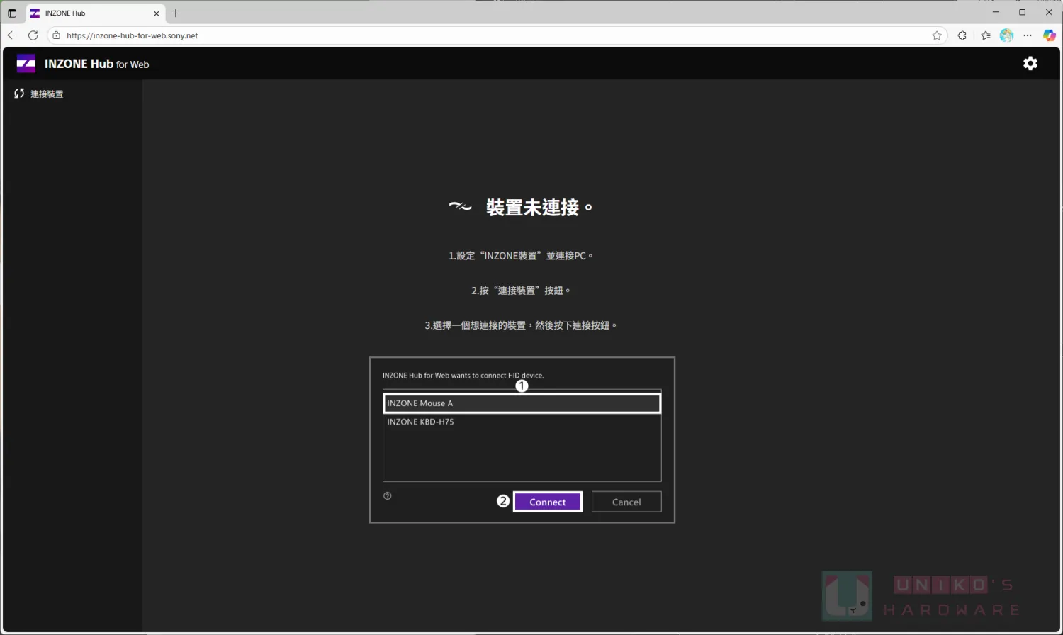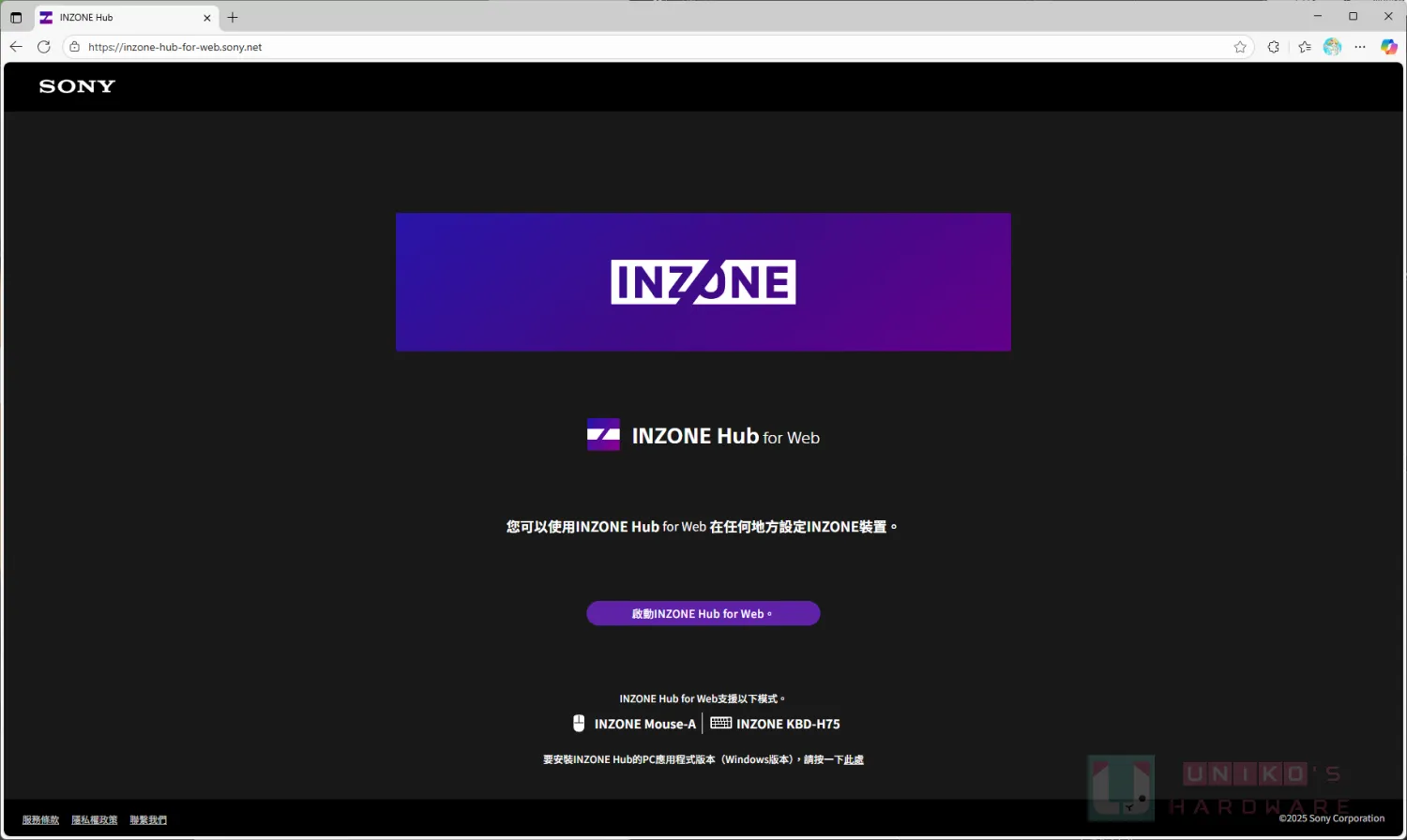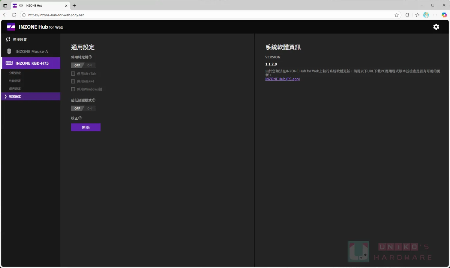 本次 Sony INZONE KBD-H75 除了傳統安裝的 INZONE HUB 以外,Sony 還為其準備了 Web 版的 INZONE HUB “INZONE Hub for Web”。目前 INZONE Hub for Web 只支援 INZONE KBD-H75 以及 INZONE Mouse-A 兩款設備。在 INZONE Hub for Web 上,除了無法進行軟體更新以外,在設定上與 INZONE HUB 並無二致。下方展示部分採用 INZONE HUB for Web。