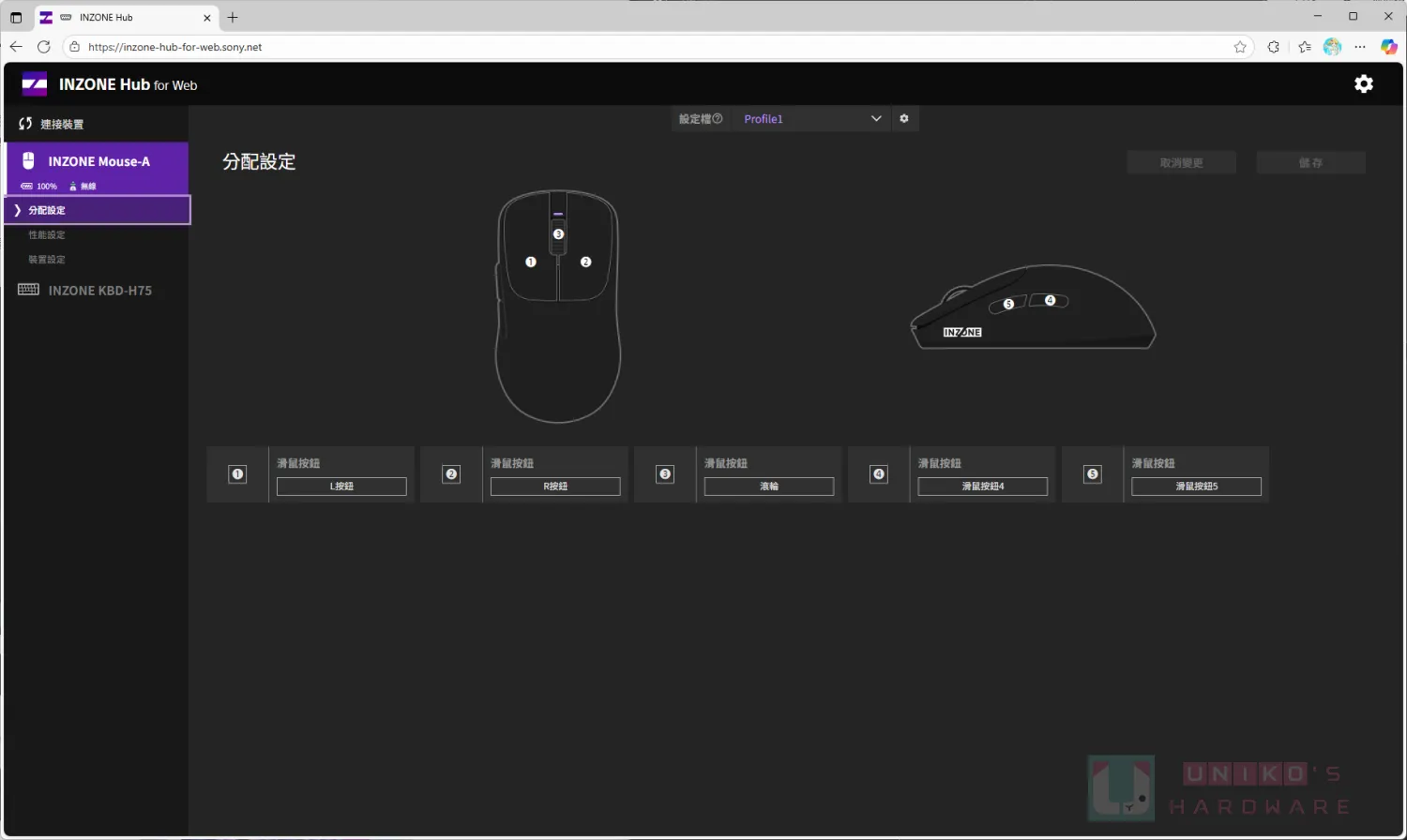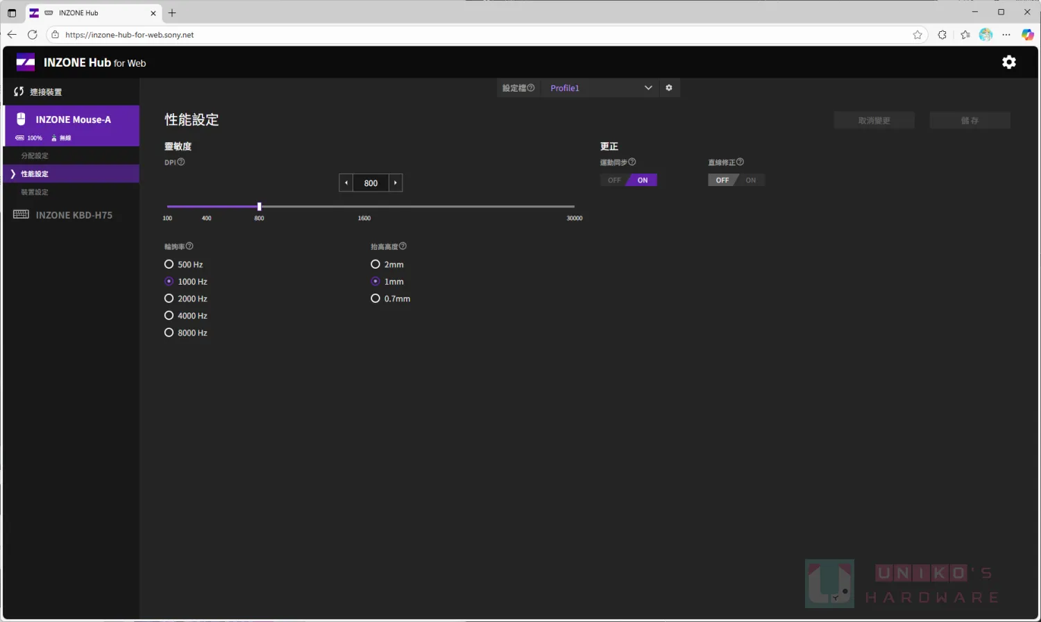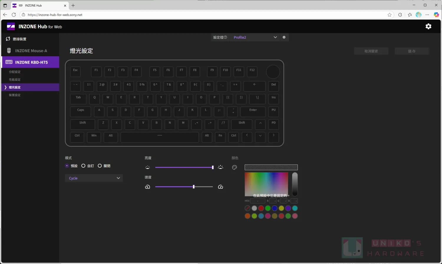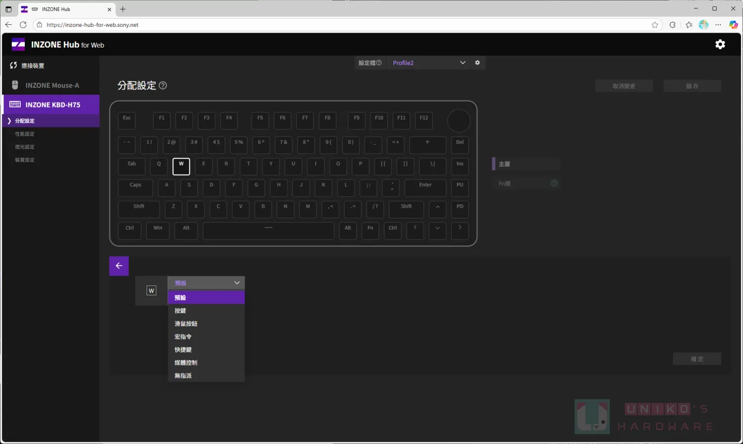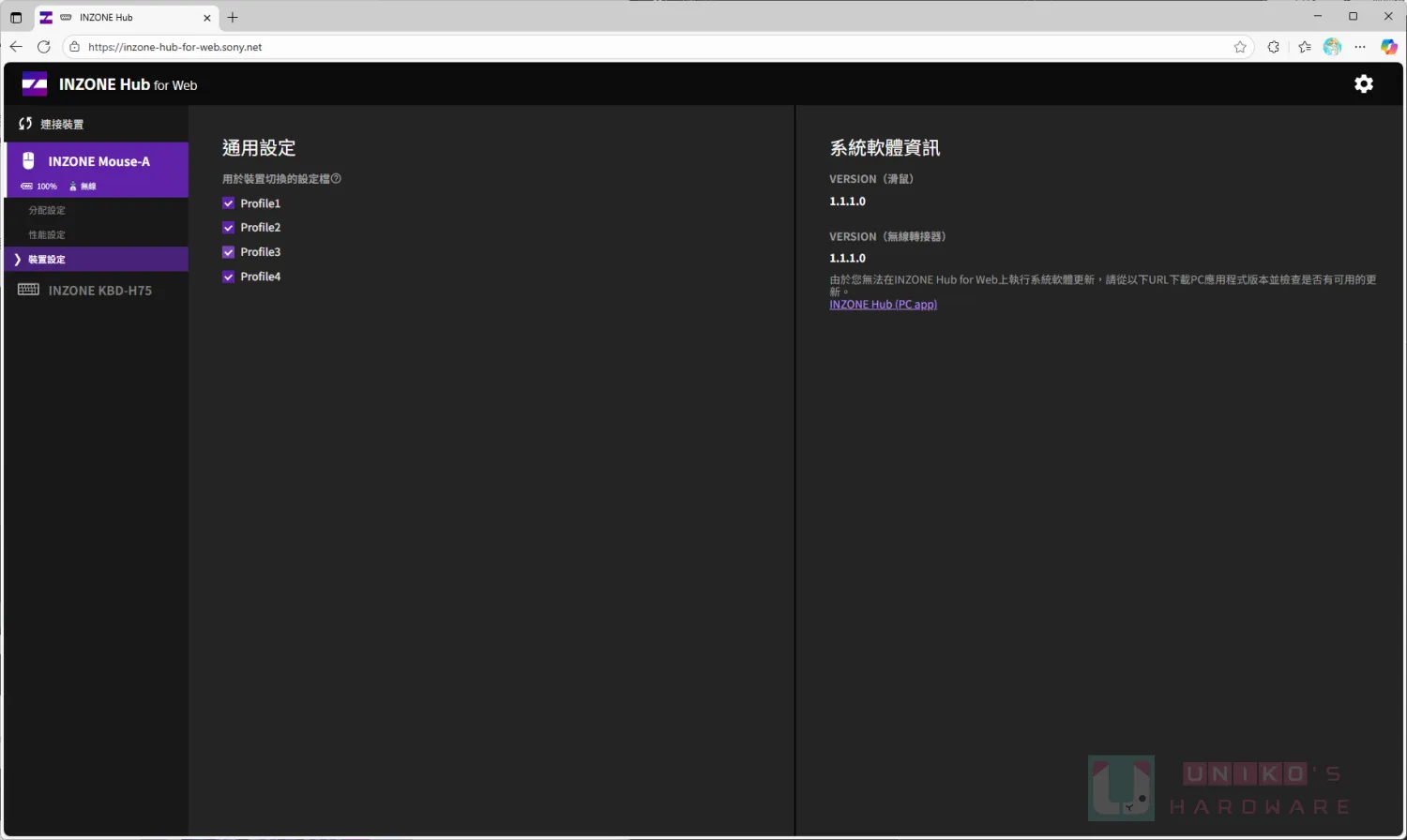 在裝置設定選單,可以啟用停用設定檔,與 KBD-H75 相同,會提示使用者在 Web 上是無法更新軟體,需要使用安裝版 INZONE HUB。