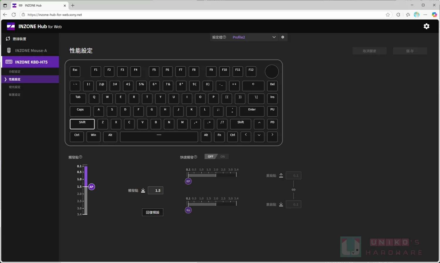 在性能設定選單,是本次 KBD-H75 的重點所在,先前所提到的按鍵觸發 0.1 ~ 3.4 mm 便是在這個選單內做設定,一樣可以針對各個按鍵單獨設定觸發點,快速觸發功能也是在此選單內做開啟。