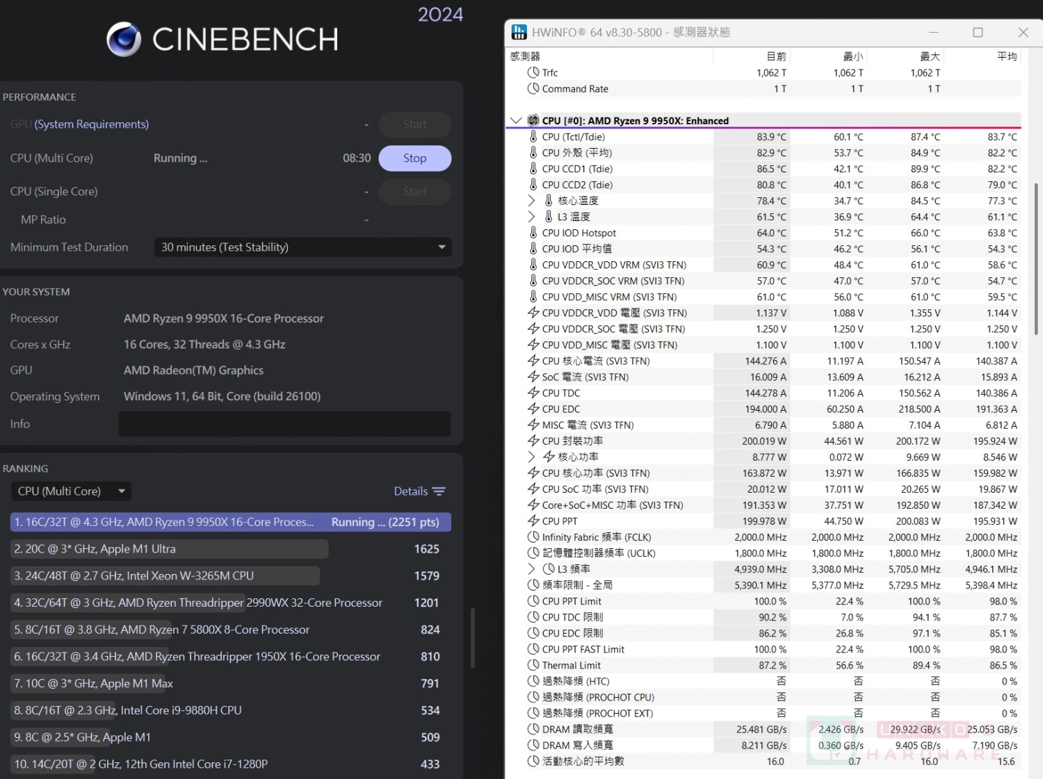 燒機實際測試,核心溫度平均來到 77.3℃、最高 84.5℃;而 CPU (Tctl / Tdie) 溫度則是平均 83.7℃、最高溫 87.4℃,功耗來到 200W。