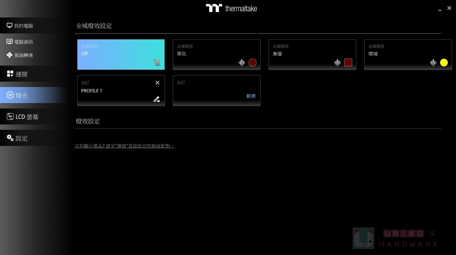燈光部分可針對全域燈效進行設定,並且可定義設定檔。