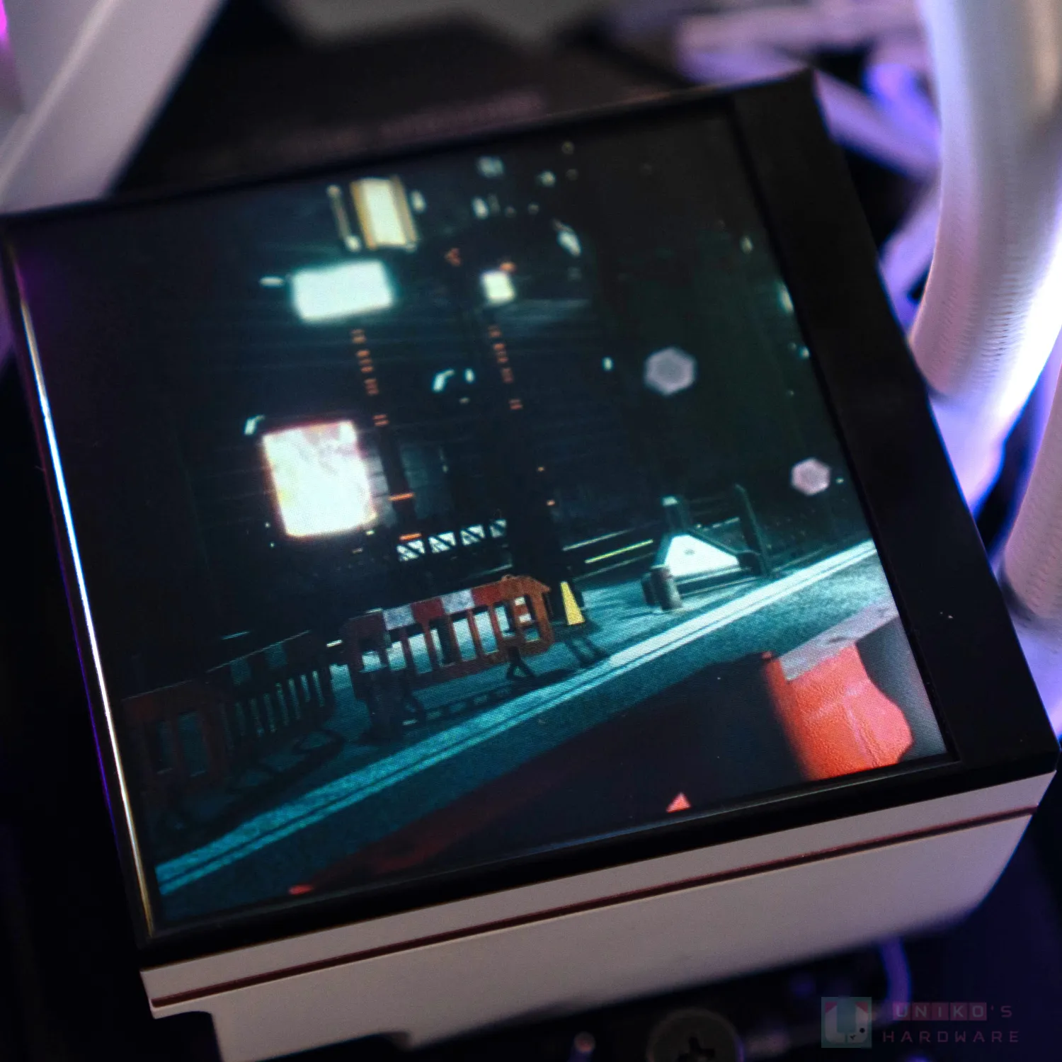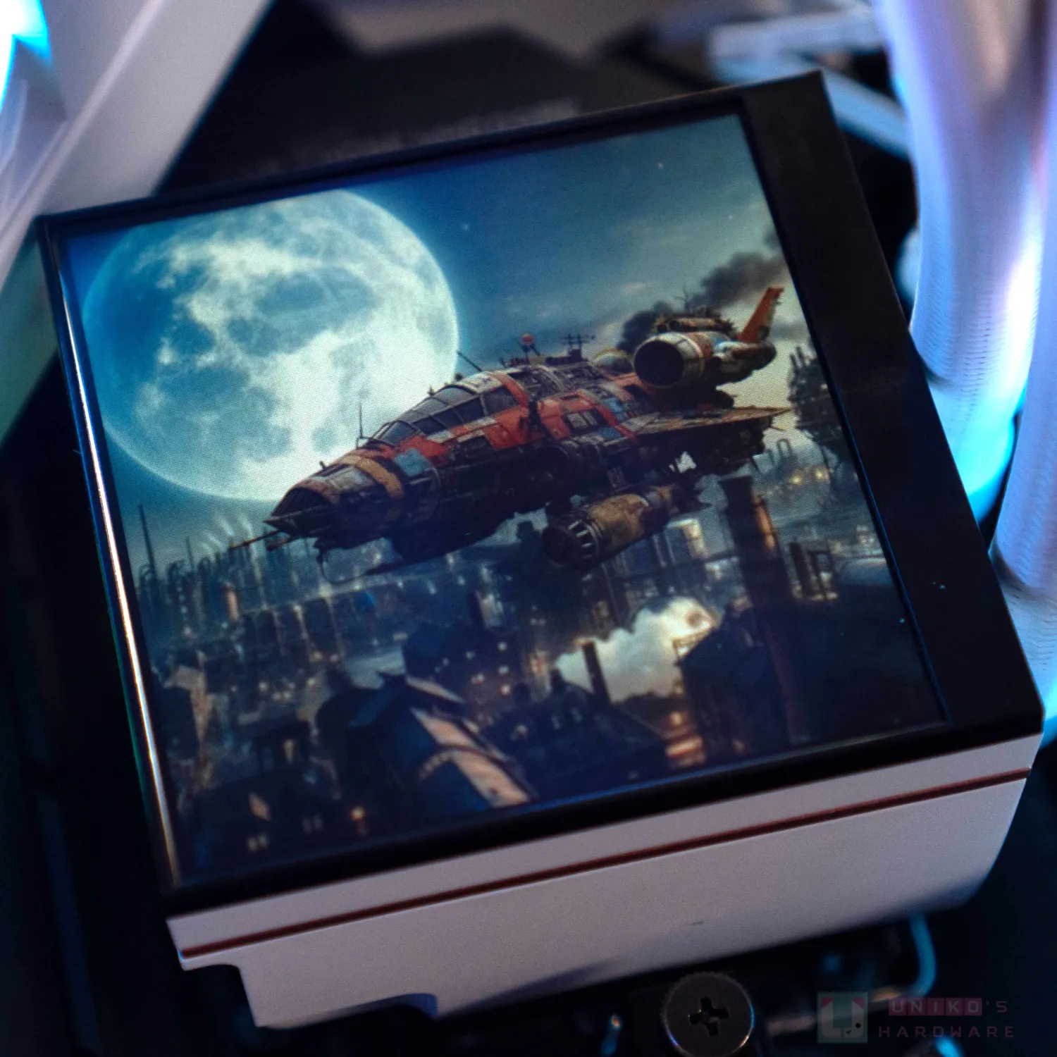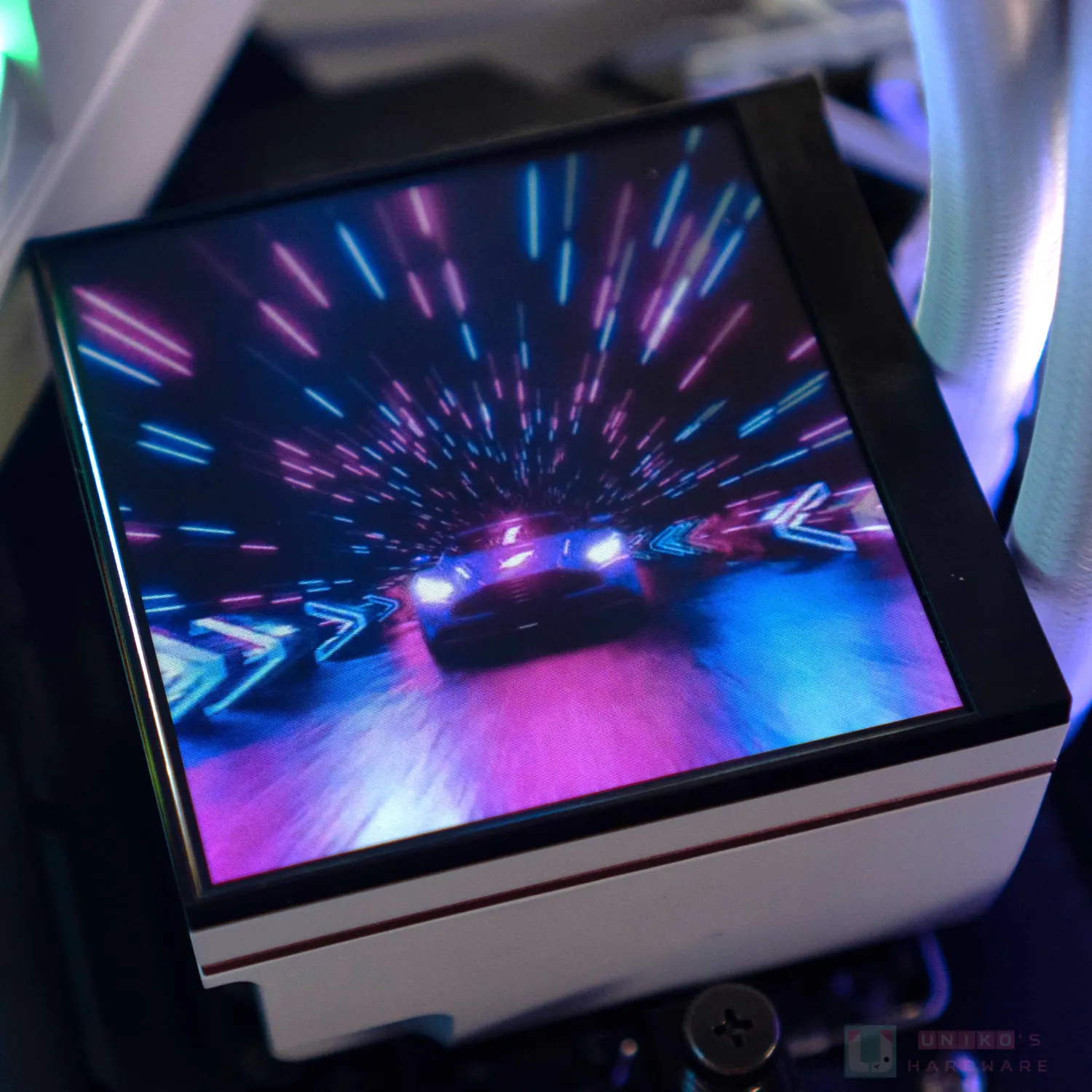這款水冷最大特點在於配備 3.95”方形窄邊框液晶螢幕,解析度是 480 x 480,可自由客製化顯示內容,不管是要即時監控 CPU、GPU 硬體狀態,還是上傳自己喜愛的靜態或 GIF 動態圖片、影片等都能輕鬆達成。