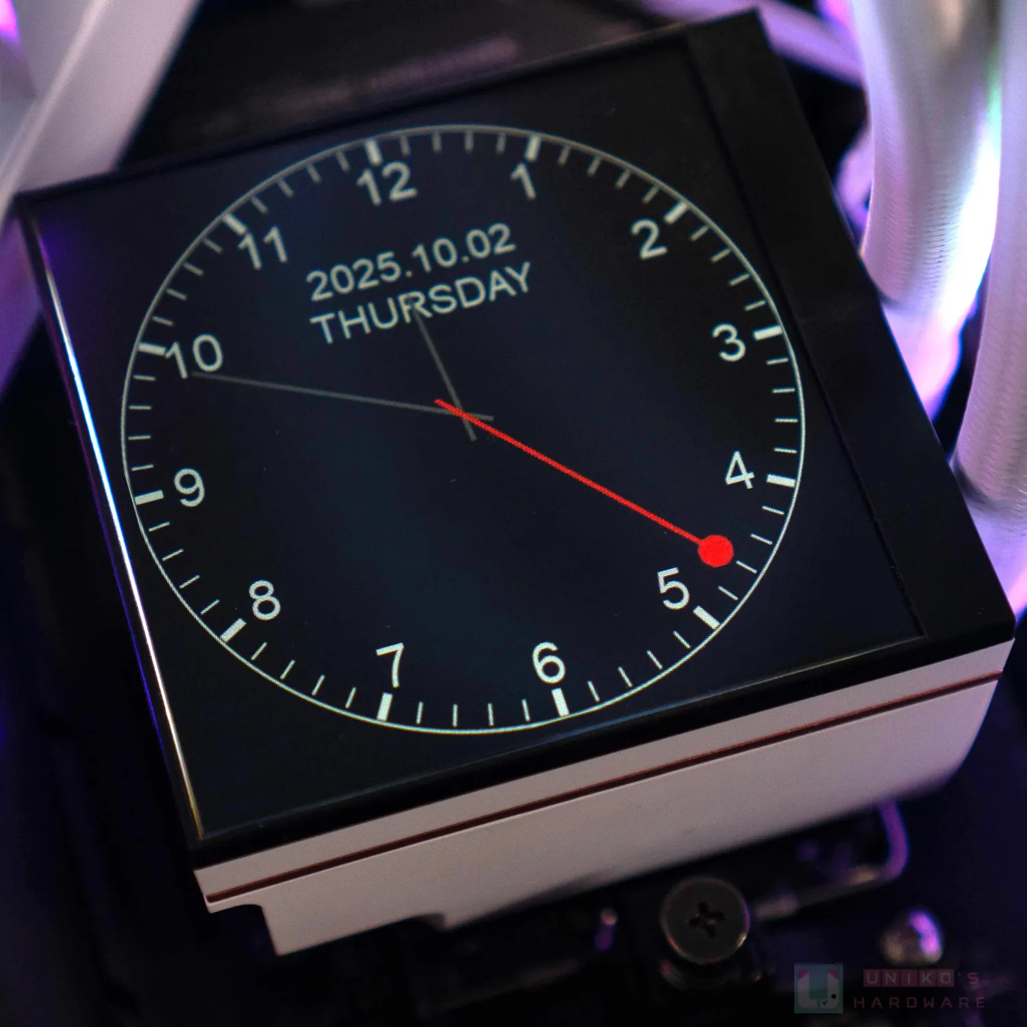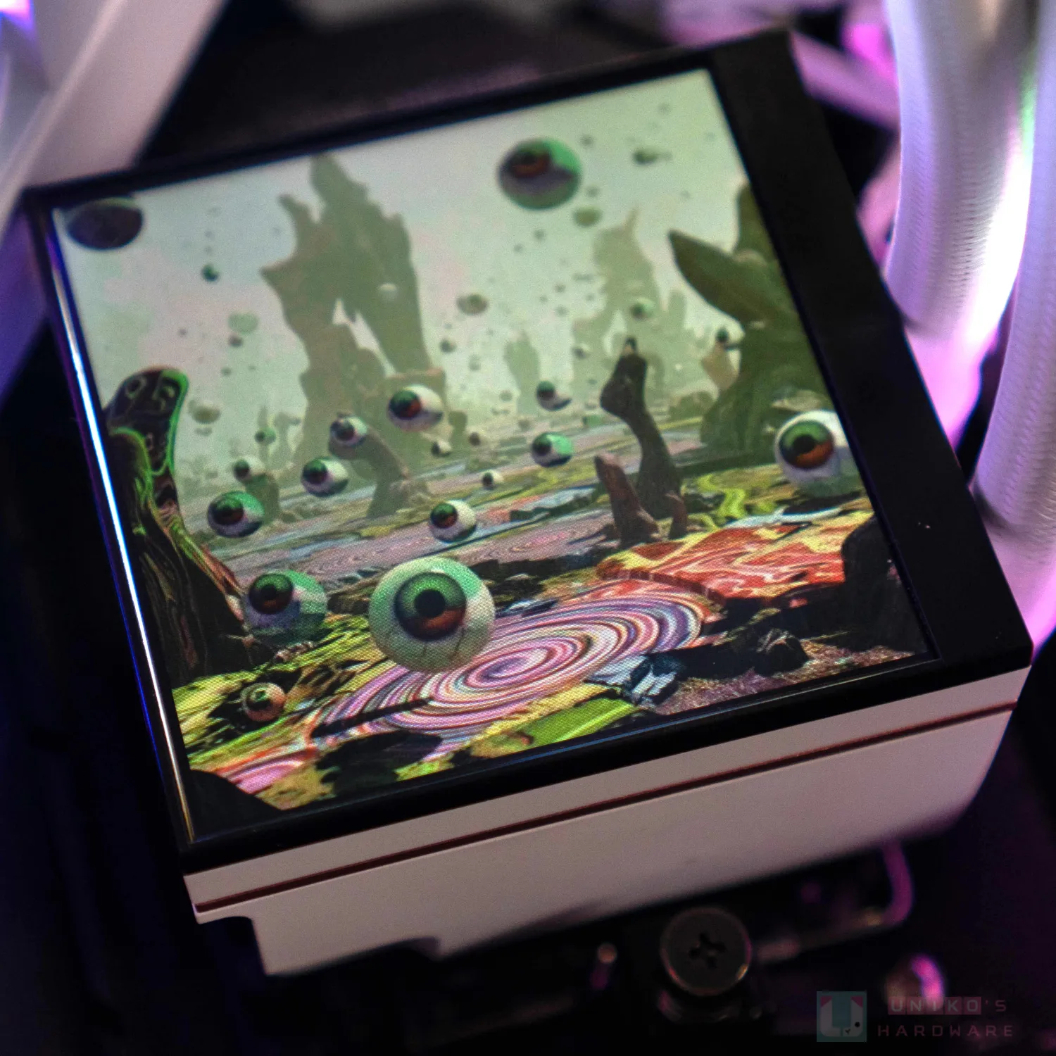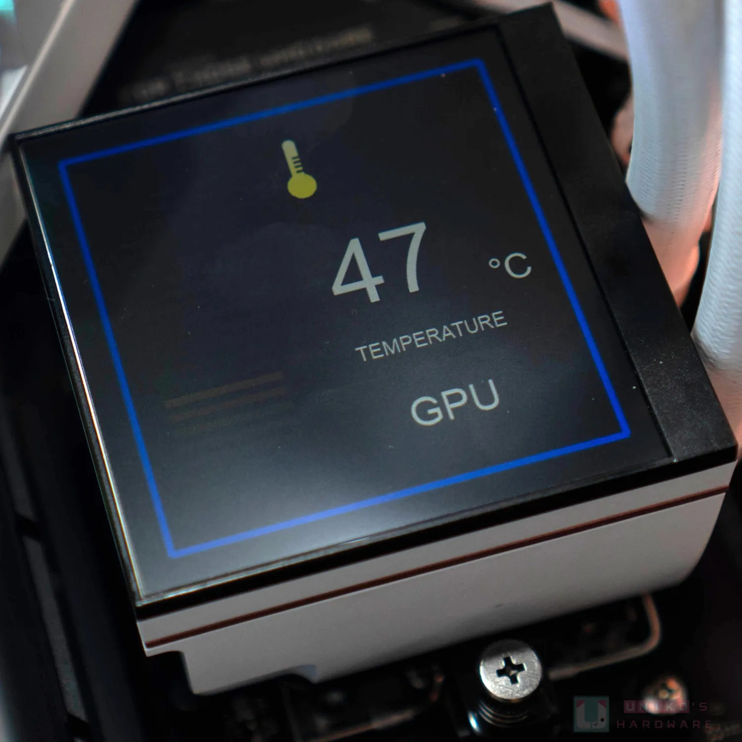 這款水冷最大特點在於配備 3.95”方形窄邊框液晶螢幕,解析度是 480 x 480,可自由客製化顯示內容,不管是要即時監控 CPU、GPU 硬體狀態,還是上傳自己喜愛的靜態或 GIF 動態圖片、影片等都能輕鬆達成。