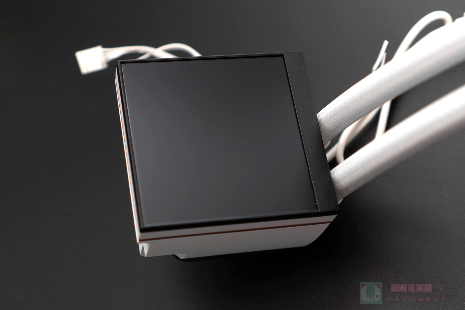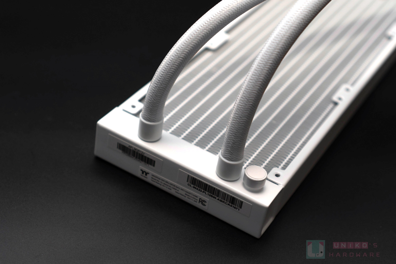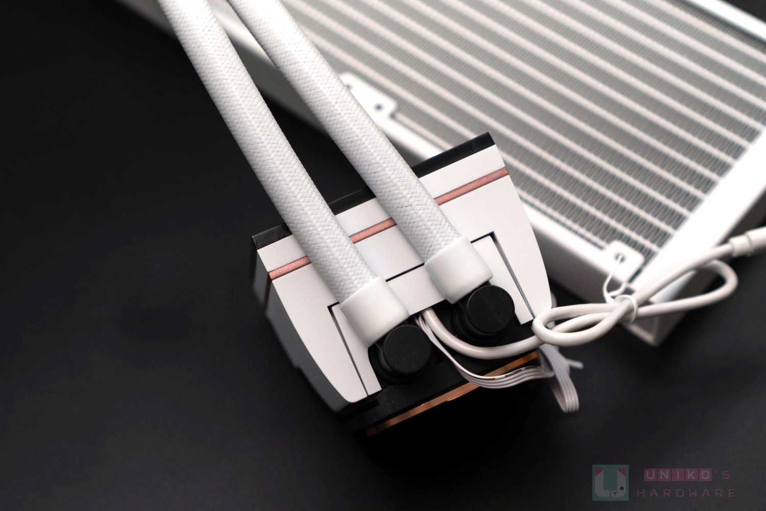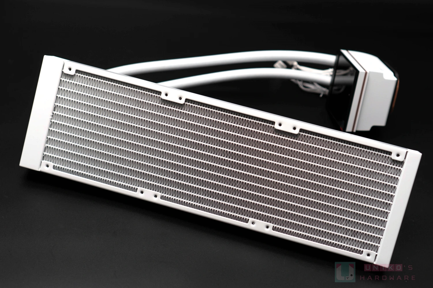 雪白版的白色水冷外型視覺相當簡約乾淨,冷排體積為 396 x 120 x 27 mm,算是相當主流的尺寸大小,上方有 12 道微水道貫串。