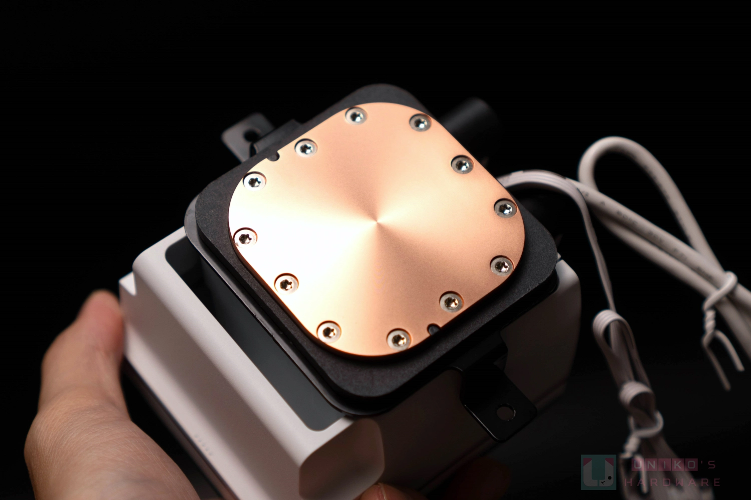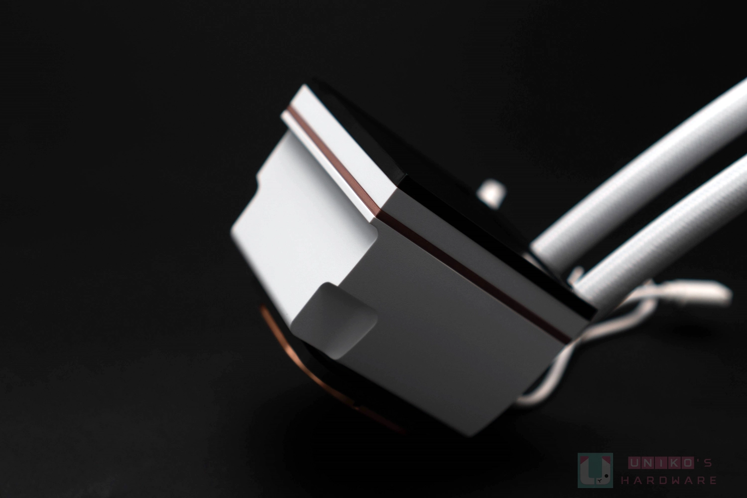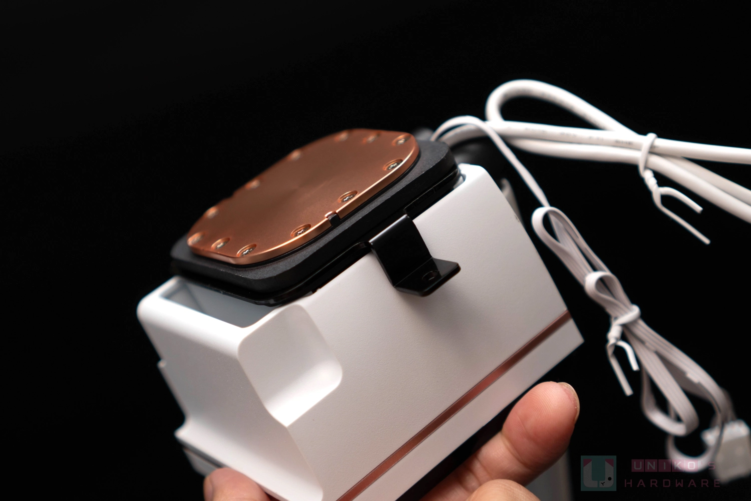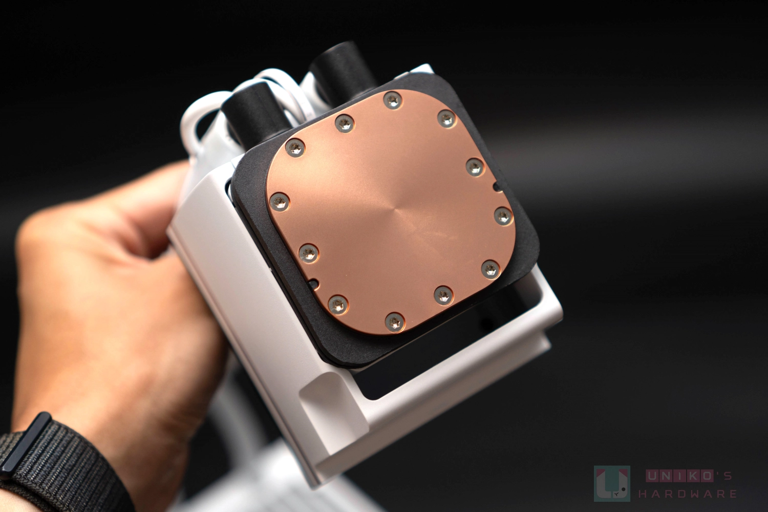 雪白版的白色水冷外型視覺相當簡約乾淨,冷排體積為 396 x 120 x 27 mm,算是相當主流的尺寸大小,上方有 12 道微水道貫串。