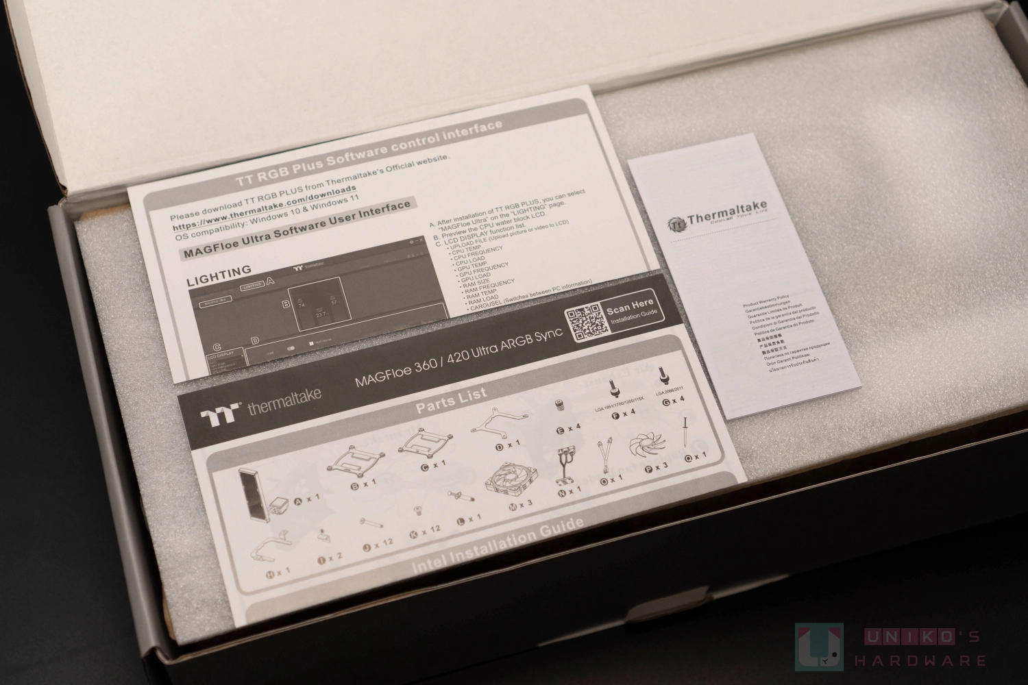 翻開內盒後,立刻看見散熱器的安裝說明書,另外也針對 TT RGB PLUS 軟體有專門的介紹說明。
