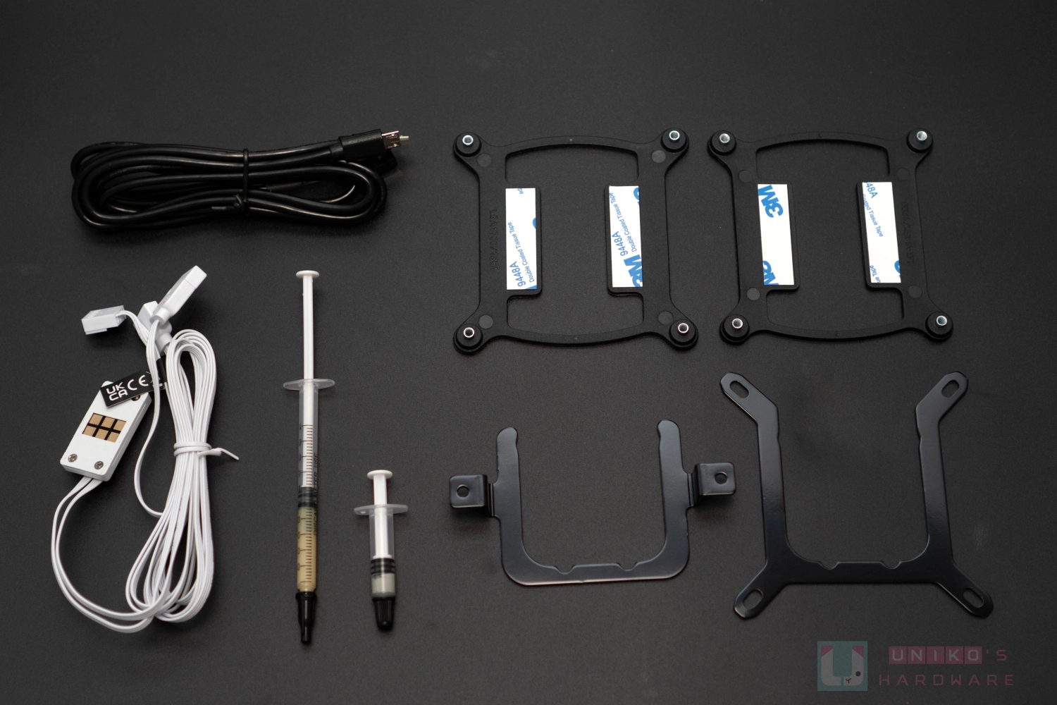 隨附配件中,除了有散熱膏以及對應 AMD / Intel 各主流腳位的扣具支援,同時額外提供水泵使用的 Micro-USB 轉 USB 9pin 連接線材,另外也有磁吸式串接風扇使用的磁吸供電線材。