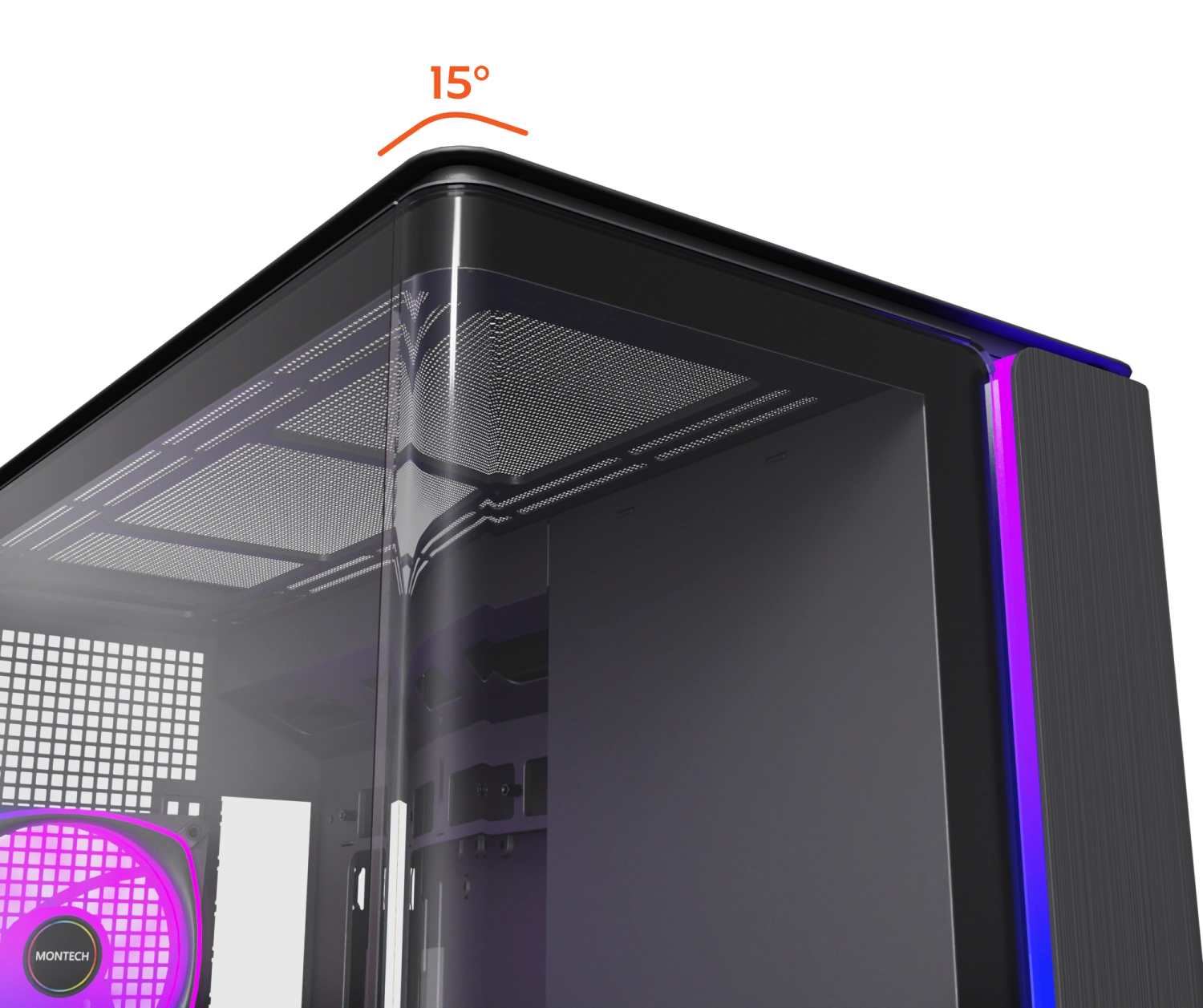 KING 45 PRO 與 KING 15 PRO 延續 KING 95 系列的經典全景曲面玻璃特色,玻璃弧度更從 30°進化至俐落有型的 15°,打造洗鍊獨到的外觀美學。機構採用相較 KING 95 纖薄 18% 的雙艙設計,完美隱藏線材、保持氣流通暢,在更精緻的空間內也能釋放完整效能。此外,獨特的傾底部精準傾角散熱風扇位置能增加進氣量,導入更多新鮮氣流,讓系統在全力運作下,依然能維持穩定優異的溫度表現。