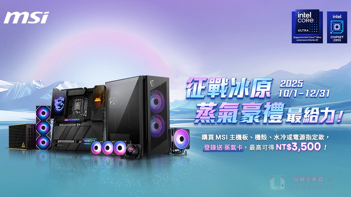 MSI 征戰冰原 蒸氣豪禮最給力 促銷活動,凡購買主機板、電源供應器、機殼、散熱器與風扇指定型號,即可獲得免費 Steam 點數,輕鬆升級你的電腦裝備,暢遊遊戲世界。