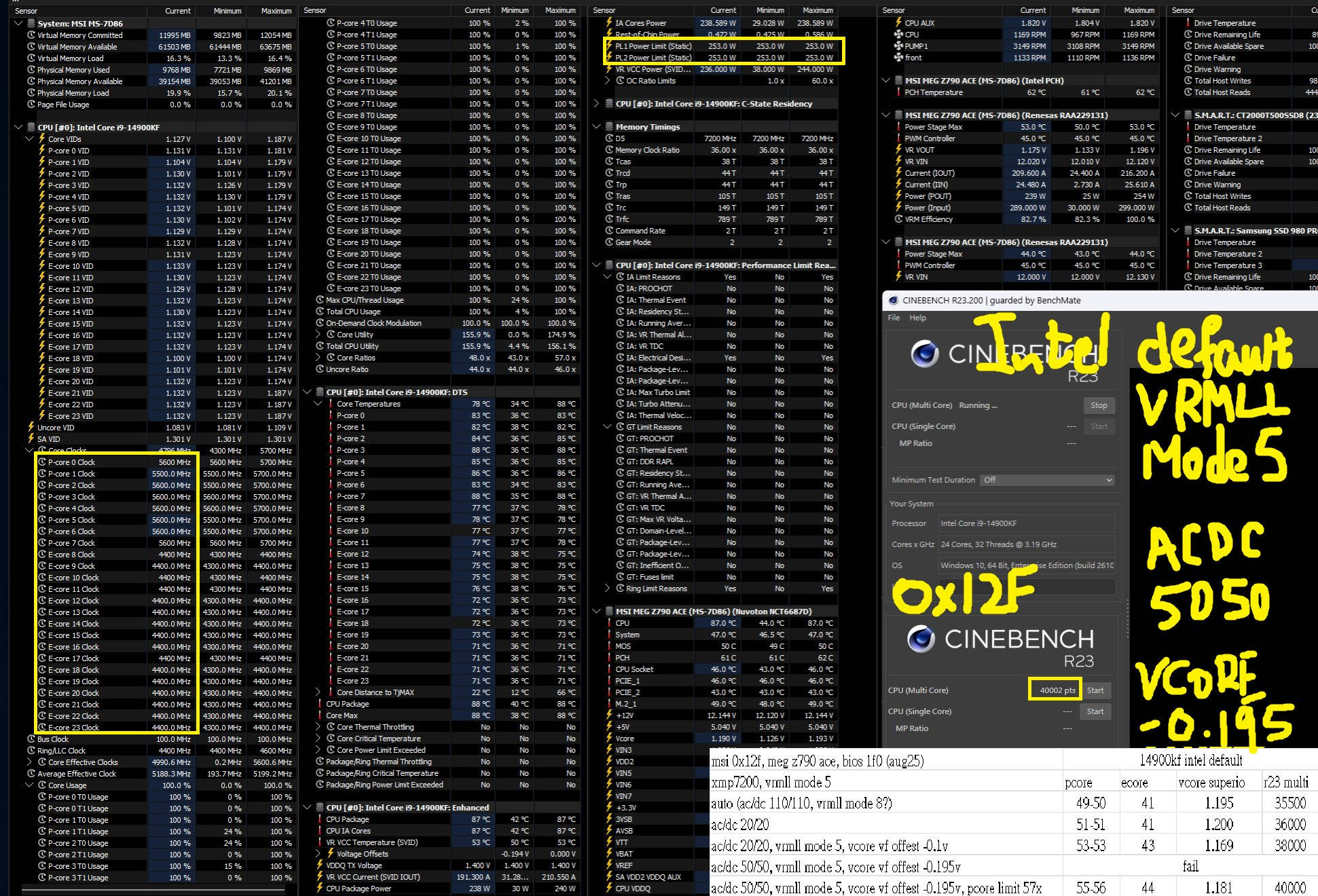 以上的結論是,一切看自身需求。如果你不介意全預設 i9-14900KF 只有 R23 36000,甚至不到的性能,那乖乖用預設就好。如果你想要取回舊有性能 (40000 以上),便可嘗試降壓,但前題是要匹配 ACLL DCLL VRMLL,不然會觸發 CEP 保護導致性能暴降。一般來說,50~70 這個區間的值還是比較理想,因為 ACLL 過低,可能導致一些場景下無法正常運作 / 完成,例如 R15。另外,50 ~ 70 也可以保證 VRM 所面對的壓力不會太高,繼而出現 OVERSHOOT UNDERSHOOT 的問題。