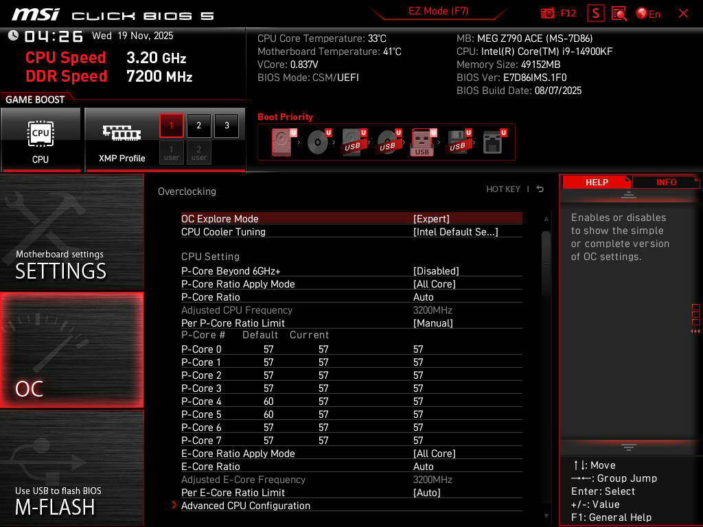 對於 i9-14900KF 來說,預設單核頻率為 6G,全核頻率為 5.7G。其實兩者頻率差距不大,所以筆者最終決定放棄 6G 單核頻率,改為設定全核 57X。這種操作可使核心所需要的電壓大幅下降,甚至換來更高的穩定性。