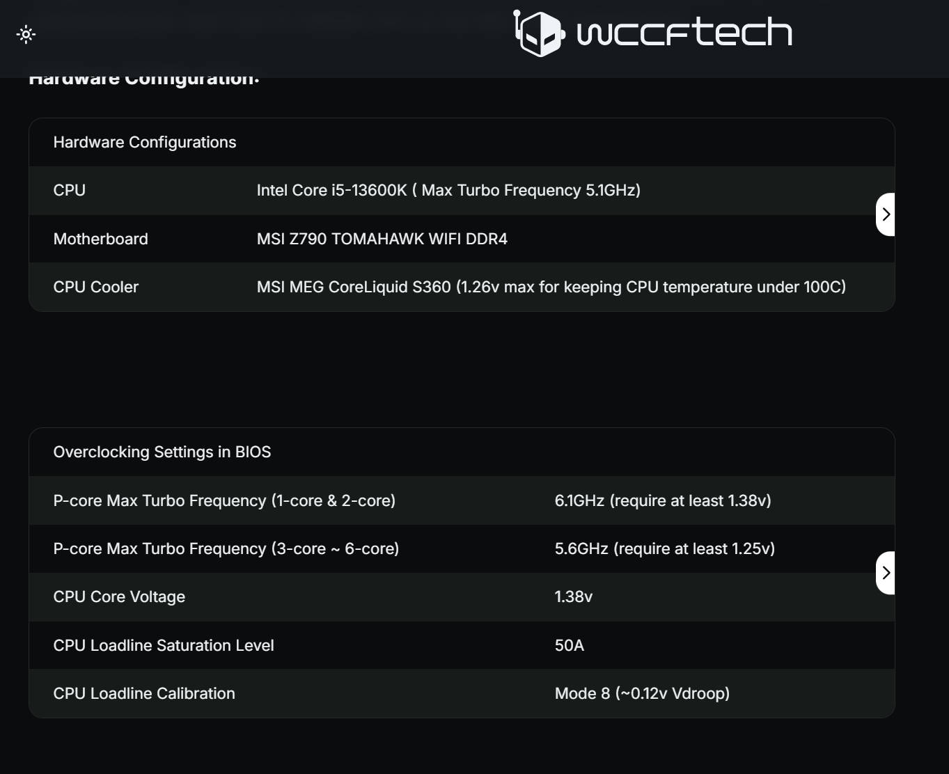 參考微星與 WCCFTECH 的 LOADLINE SATURATION 介紹 (連結),微星給出的例子是以 i5-13600K 比對單核 6.1G 跟全核 5.6G 所須的電壓。兩者電壓所須分別是 1.38V 與 1.25V,相差 0.13V。依筆者理解,這也是說,為了再多 0.5G 單核頻率,核心電壓需要增加 0.13V。要是只給了 1.25V,應該是無法跑出 6.1G 單核頻率 (只能跑 5.6G)。